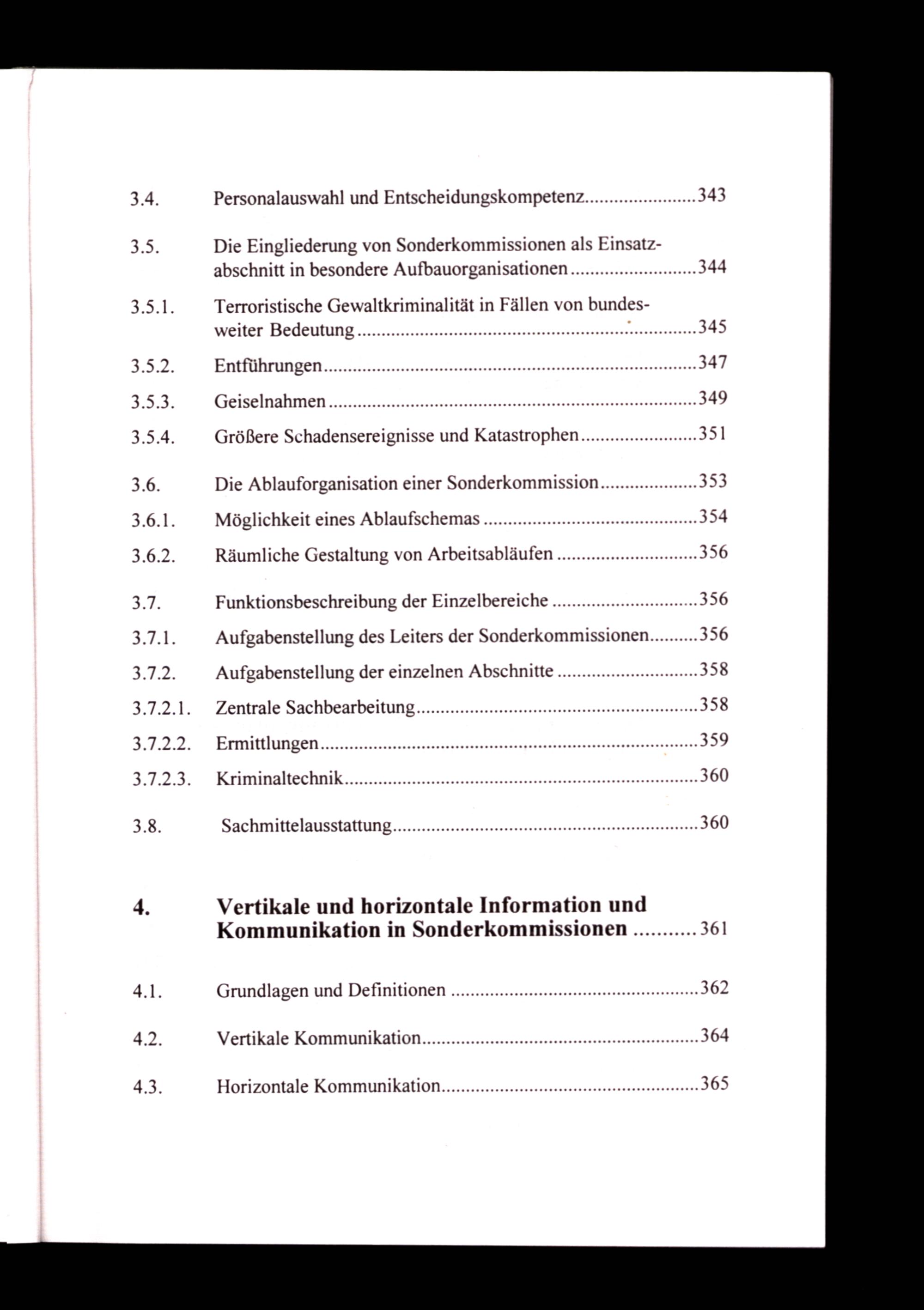 weiter Bedeutung... rer nern re EEEEEHGHKEHET EHEN HHEEEEATSEUENG 345 EntführungeN..-.....: rs rer ern er HRSERAEREKRUFENDEEFETHENHEN ET KE NEE ANWAUNAUS 347 GeiselnahmenN.................05r.r00r0r0 sr re re rens.n......NLEUELEKEKKEEEEEUEUEGUGUEEGG 349 Größere Schadensereignisse und Katastrophen.......................- 351 Die Ablauforganisation einer SonderkommiSssiON...................- 353 Möglichkeit eines Ablaufschemas.............4.0400400000000 0000 E EEE 354 Räumliche Gestaltung von Arbeitsabläufen...................040000404 356 Funktionsbeschreibung der Einzelbereiche.....................4.40++++ 356 Aufgabenstellung des Leiters der Sonderkommissionen.......... 356 Aufgabenstellung der einzelnen Abschnitte...................0440444++ 358 Zentrale Sachbearbeitung................0.000000000000rr EEE 358 Ermittiungel............rrrr rer EE.EG}ANMMEÄNNGFAEEUEETENUHEUEUGUUEUGUUN 359 Kriminaltechnik....................0..0r.0r40rr04r00r00.0........EBBEMUEEUEEGETEEEEEEEG 360 Sachmittelausstattung................0.000000000000000rr EEE EEE 360