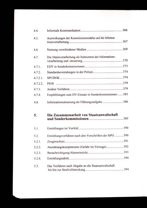 verarbeitung und-steuerunß..................000000000rr EEE 370 EDV in SonderkommissioNeN.........ere rer rer rer 373 Standardanwendungen in der Polizei........................0..200400400400- 374 440190) REN N 374 PIOS srirre reinen er eREREHCHAHERAMTANEFÄNTUNTENEHET EU TENNTREESTEUMHUNUTUURE LEE HERE ÄnG 379 Andere Verfähren sure ner ere tan aMEGEMMEEHETEUFEHDONENETUE 379 Empfehlungen zum DV-Einsatz in Sonderkommissionen....... 383 Informationssteuerung als Führungsaufgabe........................+.- 386