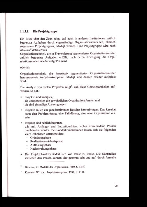 Ein Blick über den Zaun zeigt, daß auch in anderen Institutionen zeitlich begrenzte Aufgaben durch eigenständige Organisationseinheiten, nämlich sogenannte Projektgruppen, erledigt werden. Eine Projektgruppe wird nach Bleicher‘ definiert als