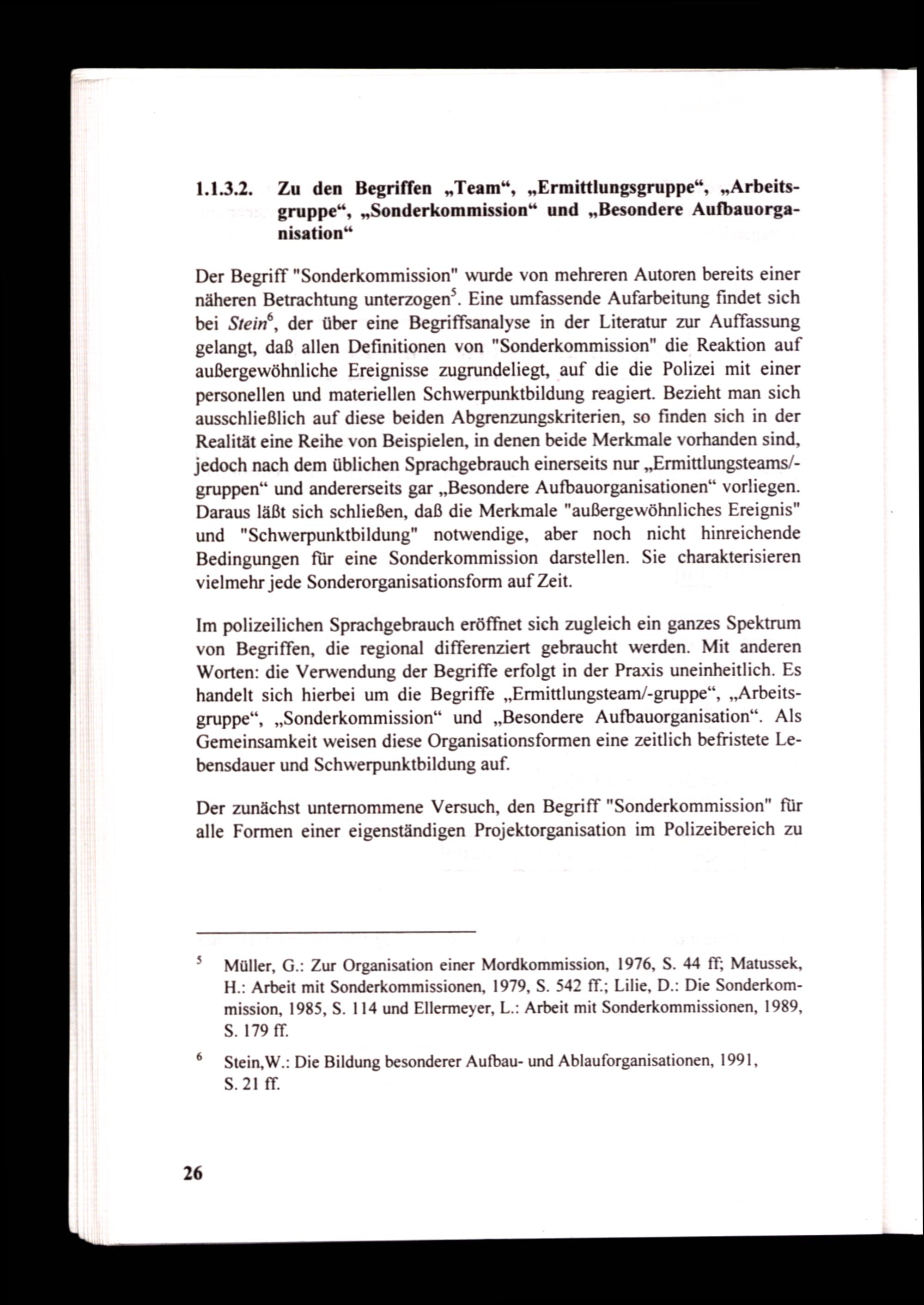Der Begriff"Sonderkommission" wurde von mehreren Autoren bereits einer näheren Betrachtung unterzogen”. Eine umfassende Aufarbeitung findet sich bei Stein®, der über eine Begriffsanalyse in der Literatur zur Auffassung gelangt, daß allen Definitionen von"Sonderkommission" die Reaktion auf außergewöhnliche Ereignisse zugrundeliegt, auf die die Polizei mit einer personellen und materiellen Schwerpunktbildung reagiert. Bezieht man sich ausschließlich auf diese beiden Abgrenzungskriterien, so finden sich in der Realität eine Reihe von Beispielen, in denen beide Merkmale vorhanden sind, jedoch nach dem üblichen Sprachgebrauch einerseits nur„Ermittlungsteams/gruppen“ und andererseits gar„Besondere Aufbauorganisationen“ vorliegen. Daraus läßt sich schließen, daß die Merkmale"außergewöhnliches Ereignis" und"Schwerpunktbildung" notwendige, aber noch nicht hinreichende Bedingungen für eine Sonderkommission darstellen. Sie charakterisieren vielmehr jede Sonderorganisationsform auf Zeit.