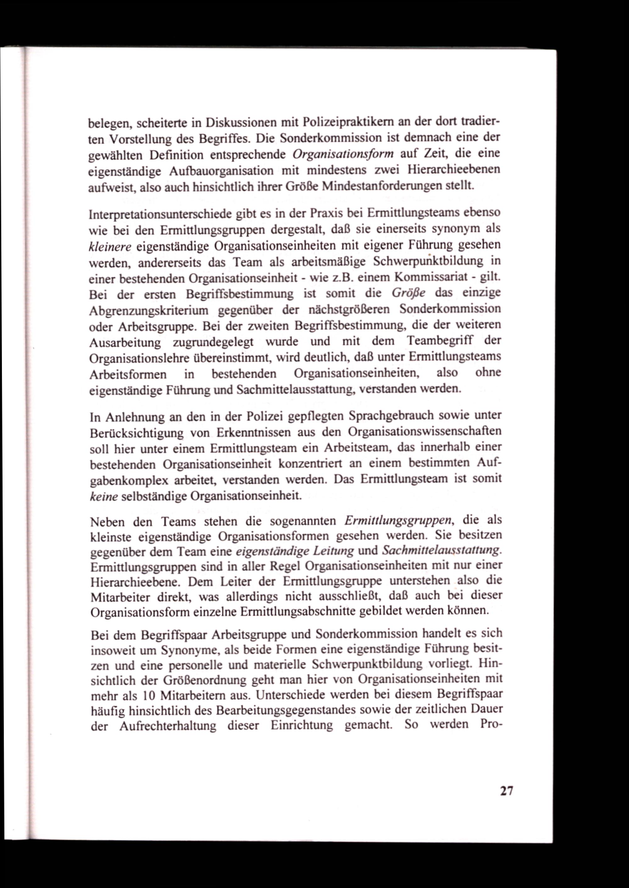 Interpretationsunterschiede gibt es in der Praxis bei Ermittlungsteams ebenso wie bei den Ermittlungsgruppen dergestalt, daß sie einerseits synonym als kleinere eigenständige Organisationseinheiten mit eigener Führung gesehen werden, andererseits das Team als arbeitsmäßige Schwerpunktbildung in einer bestehenden Organisationseinheit- wie z.B. einem Kommissariat- gilt. Bei der ersten Begriffsbestimmung ist somit die Größe das einzige Abgrenzungskriterium gegenüber der nächstgrößeren Sonderkommission oder Arbeitsgruppe. Bei der zweiten Begriffsbestimmung, die der weiteren Ausarbeitung zugrundegelegt wurde und mit dem Teambegriff der Organisationslehre übereinstimmt, wird deutlich, daß unter Ermittlungsteams Arbeitsformen in bestehenden Organisationseinheiten, also ohne eigenständige Führung und Sachmittelausstattung, verstanden werden.