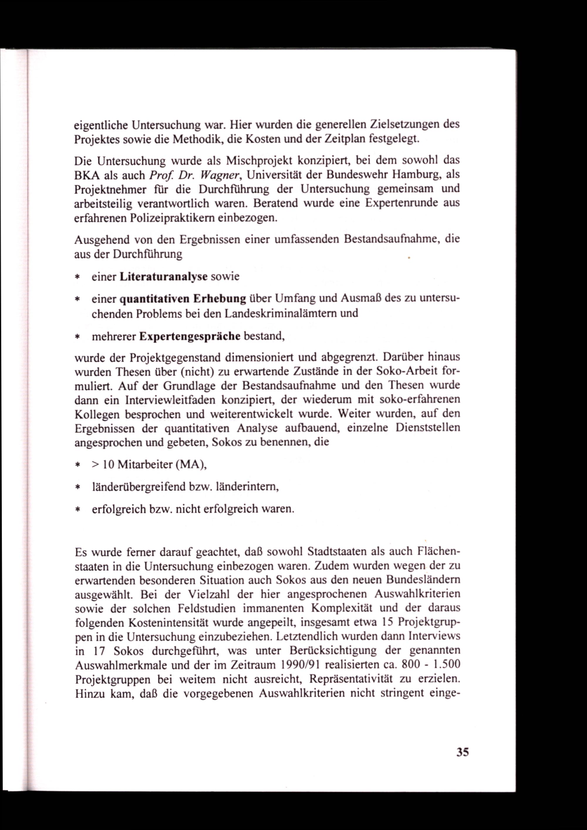 wurde der Projektgegenstand dimensioniert und abgegrenzt. Darüber hinaus wurden Thesen über(nicht) zu erwartende Zustände in der Soko-Arbeit formuliert. Auf der Grundlage der Bestandsaufnahme und den Thesen wurde dann ein Interviewleitfaden konzipiert, der wiederum mit soko-erfahrenen Kollegen besprochen und weiterentwickelt wurde. Weiter wurden, auf den Ergebnissen der quantitativen Analyse aufbauend, einzelne Dienststellen angesprochen und gebeten, Sokos zu benennen, die