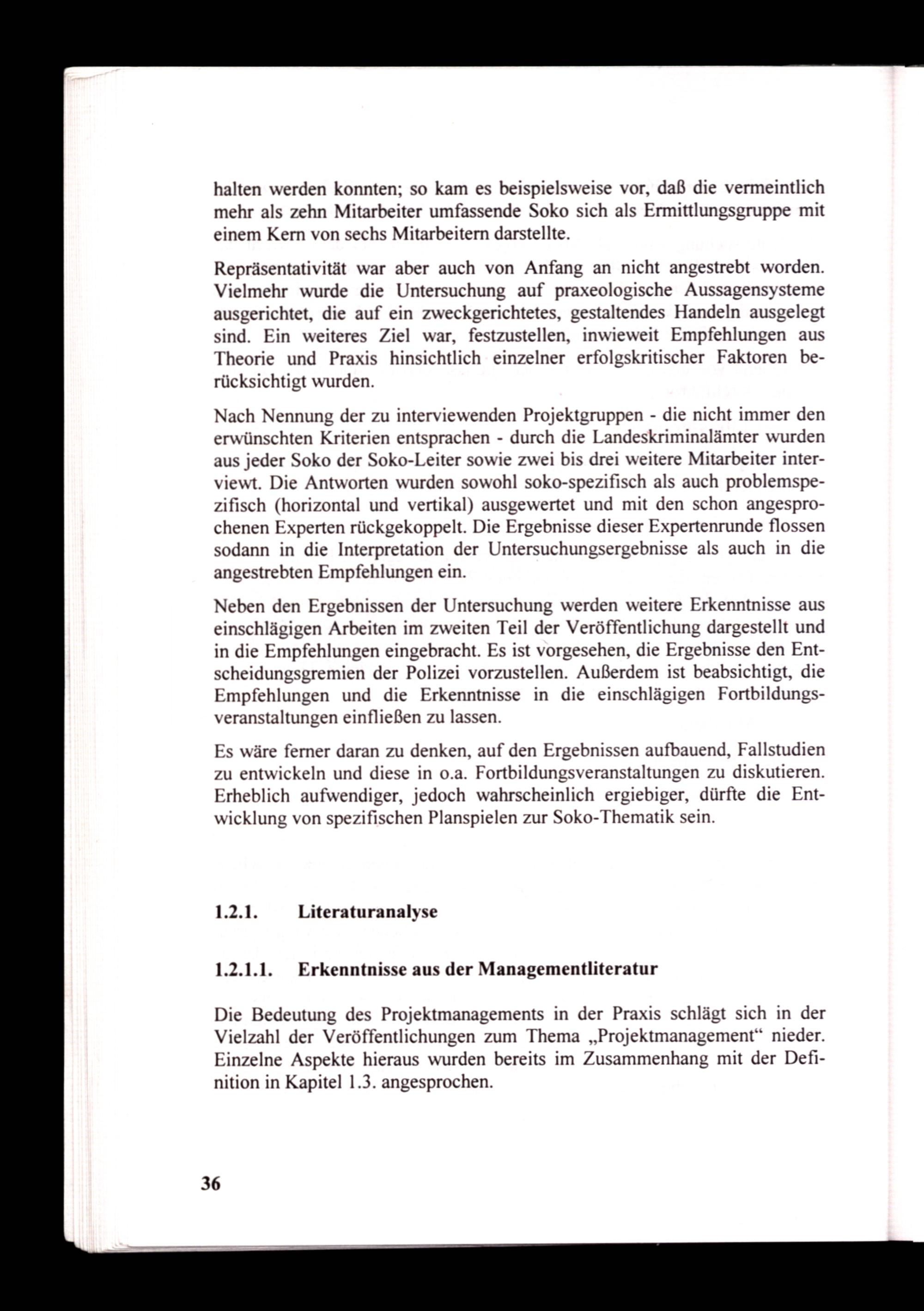 Nach Nennung der zu interviewenden Projektgruppen- die nicht immer den erwünschten Kriterien entsprachen- durch die Landeskriminalämter wurden aus jeder Soko der Soko-Leiter sowie zwei bis drei weitere Mitarbeiter interviewt. Die Antworten wurden sowohl soko-spezifisch als auch problemspezifisch(horizontal und vertikal) ausgewertet und mit den schon angesprochenen Experten rückgekoppelt. Die Ergebnisse dieser Expertenrunde flossen sodann in die Interpretation der Untersuchungsergebnisse als auch in die angestrebten Empfehlungen ein.