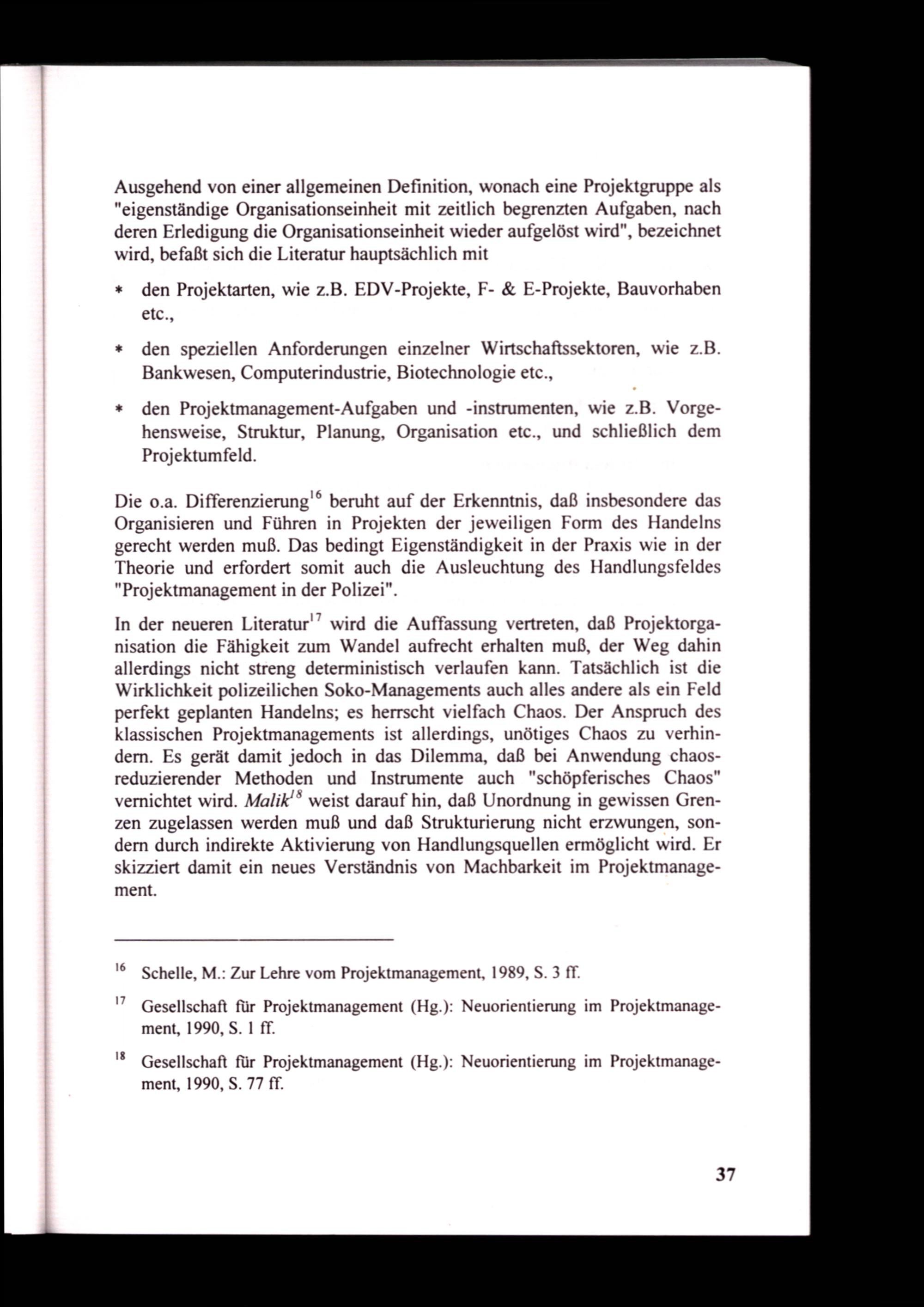 In der neueren Literatur'’ wird die Auffassung vertreten, daß Projektorganisation die Fähigkeit zum Wandel aufrecht erhalten muß, der Weg dahin allerdings nicht streng deterministisch verlaufen kann. Tatsächlich ist die Wirklichkeit polizeilichen Soko-Managements auch alles andere als ein Feld perfekt geplanten Handelns; es herrscht vielfach Chaos. Der Anspruch des klassischen Projektmanagements ist allerdings, unötiges Chaos zu verhindern. Es gerät damit jedoch in das Dilemma, daß bei Anwendung chaosreduzierender Methoden und Instrumente auch"schöpferisches Chaos" vernichtet wird. Malik'* weist darauf hin, daß Unordnung in gewissen Grenzen zugelassen werden muß und daß Strukturierung nicht erzwungen, sondern durch indirekte Aktivierung von Handlungsquellen ermöglicht wird. Er skizziert damit ein neues Verständnis von Machbarkeit im Projektmanagement.