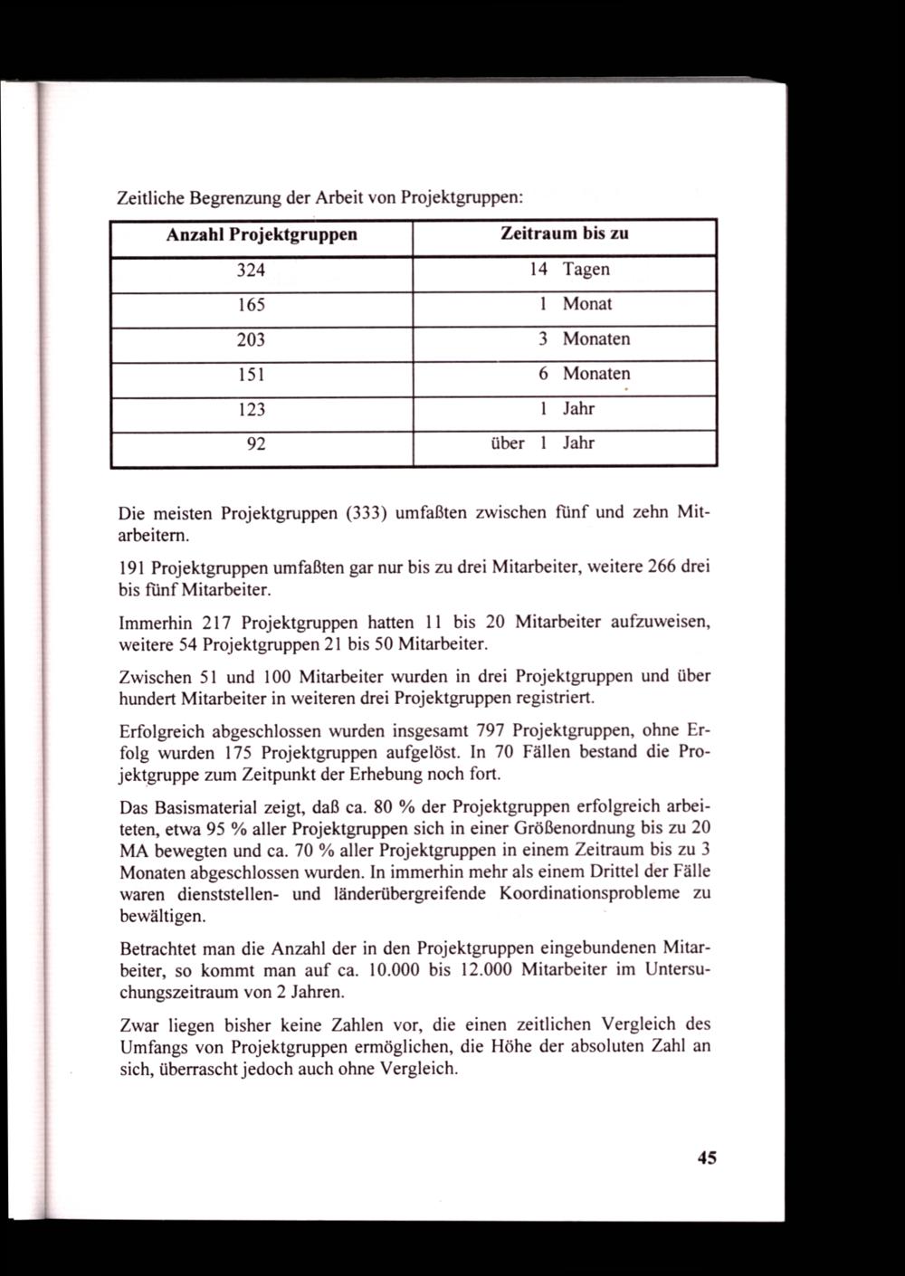 Das Basismaterial zeigt, daß ca. 80% der Projektgruppen erfolgreich arbeiteten, etwa 95% aller Projektgruppen sich in einer Größenordnung bis zu 20 MA bewegten und ca. 70% aller Projektgruppen in einem Zeitraum bis zu 3 Monaten abgeschlossen wurden. In immerhin mehr als einem Drittel der Fälle waren dienststellen- und länderübergreifende Koordinationsprobleme zu bewältigen.