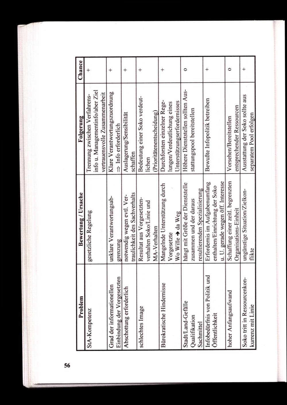 hängt mit Größe der Dienststelle zusammen und der daraus resultierenden Spezialisierung Erfordernis im Aufgabenumfang enthalten/Einrichtung der Soko u. U. gerade wegen öff. Interesse Schaffung einer zeitl. begrenzten Organisations-Einheit ungünstige Situation/Zielkonflikte