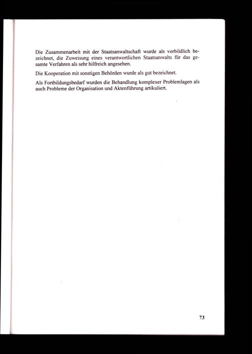 Die Zusammenarbeit mit der Staatsanwaltschaft wurde als vorbildlich bezeichnet, die Zuweisung eines verantwortlichen Staatsanwalts für das gesamte Verfahren als sehr hilfreich angesehen.