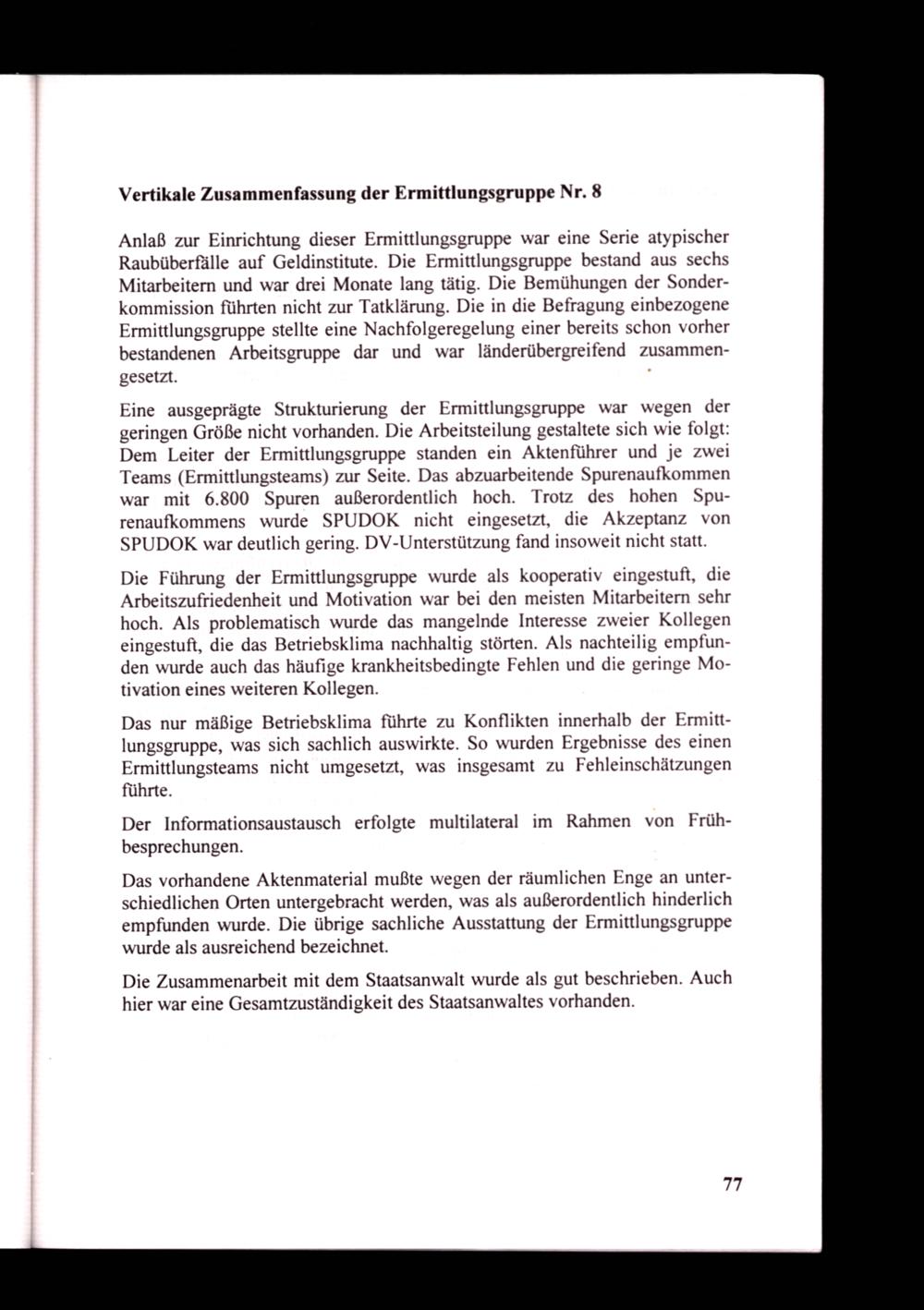 Anlaß zur Einrichtung dieser Ermittlungsgruppe war eine Serie atypischer Raubüberfälle auf Geldinstitute. Die Ermittlungsgruppe bestand aus sechs Mitarbeitern und war drei Monate lang tätig. Die Bemühungen der Sonderkommission führten nicht zur Tatklärung. Die in die Befragung einbezogene Ermittlungsgruppe stellte eine Nachfolgeregelung einer bereits schon vorher bestandenen Arbeitsgruppe dar und war länderübergreifend zusammengesetzt.