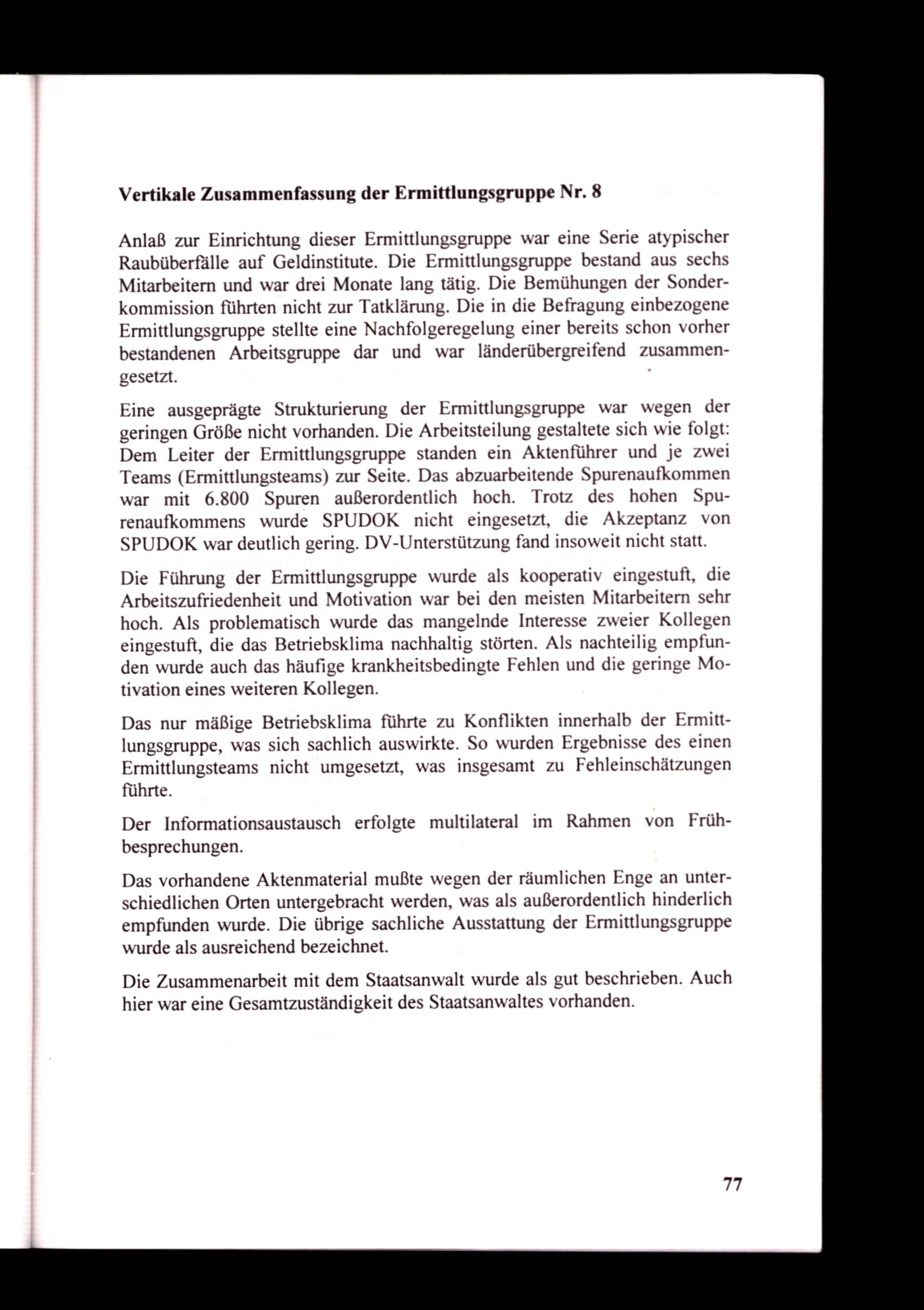 Die Führung der Ermittlungsgruppe wurde als kooperativ eingestuft, die Arbeitszufriedenheit und Motivation war bei den meisten Mitarbeitern sehr hoch. Als problematisch wurde das mangelnde Interesse zweier Kollegen eingestuft, die das Betriebsklima nachhaltig störten. Als nachteilig empfunden wurde auch das häufige krankheitsbedingte Fehlen und die geringe Motivation eines weiteren Kollegen.