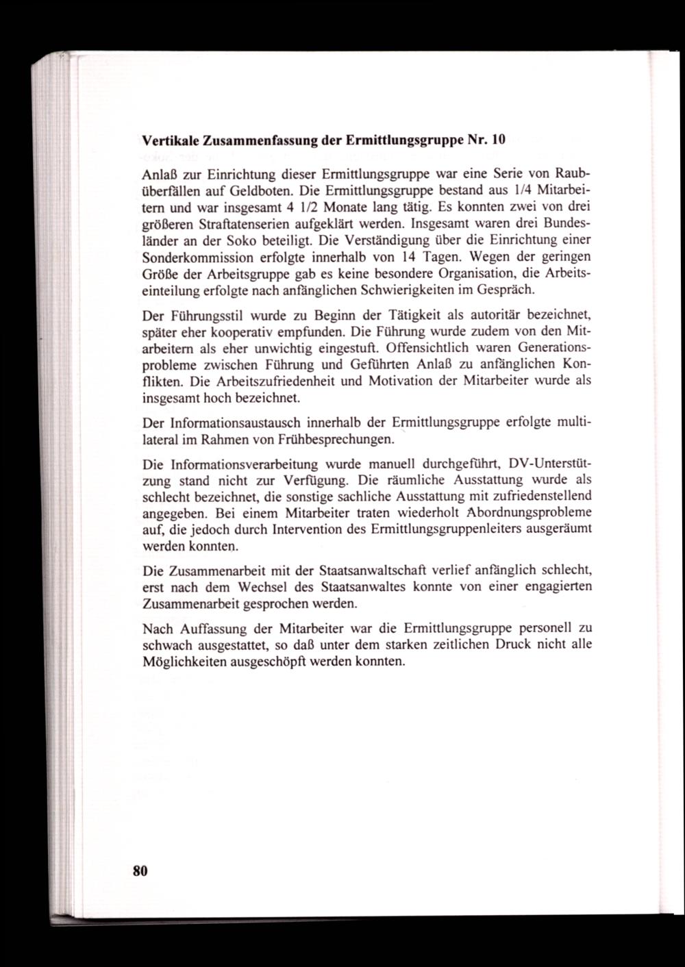Anlaß zur Einrichtung dieser Ermittlungsgruppe war eine Serie von Raubüberfällen auf Geldboten. Die Ermittlungsgruppe bestand aus 1/4 Mitarbeitern und war insgesamt 4 1/2 Monate lang tätig. Es konnten zwei von drei größeren Straftatenserien aufgeklärt werden. Insgesamt waren drei Bundesländer an der Soko beteiligt. Die Verständigung über die Einrichtung einer Sonderkommission erfolgte innerhalb von 14 Tagen. Wegen der geringen Größe der Arbeitsgruppe gab es keine besondere Organisation, die Arbeitseinteilung erfolgte nach anfänglichen Schwierigkeiten im Gespräch.