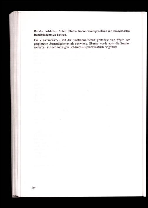Die Zusammenarbeit mit der Staatsanwaltschaft gestaltete sich wegen der gesplitteten Zuständigkeiten als schwierig. Ebenso wurde auch die Zusammenarbeit mit den sonstigen Behörden als problematisch eingestuft.