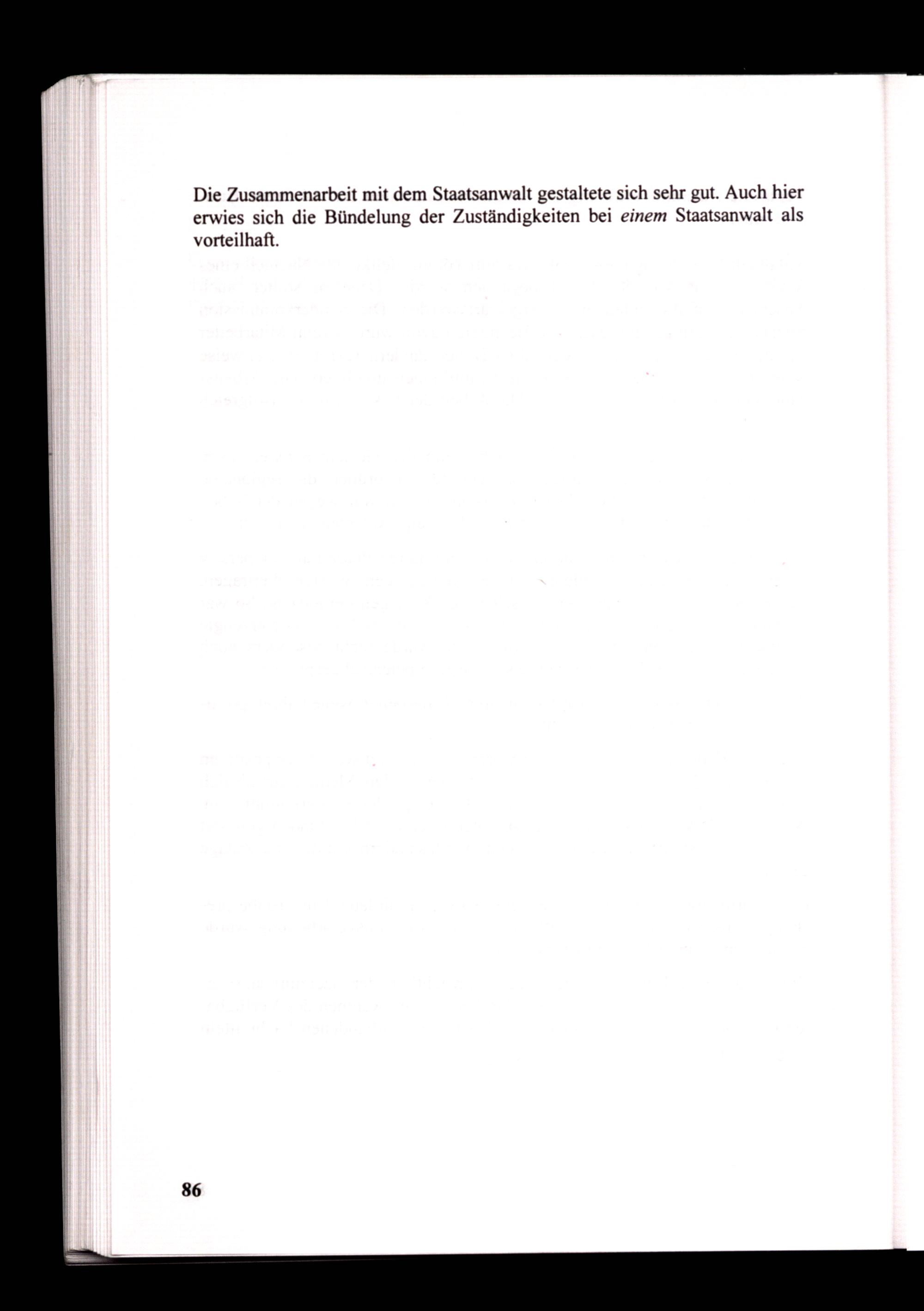 Die Zusammenarbeit mit dem Staatsanwalt gestaltete sich sehr gut. Auch hier erwies sich die Bündelung der Zuständigkeiten bei einem Staatsanwalt als vorteilhaft.