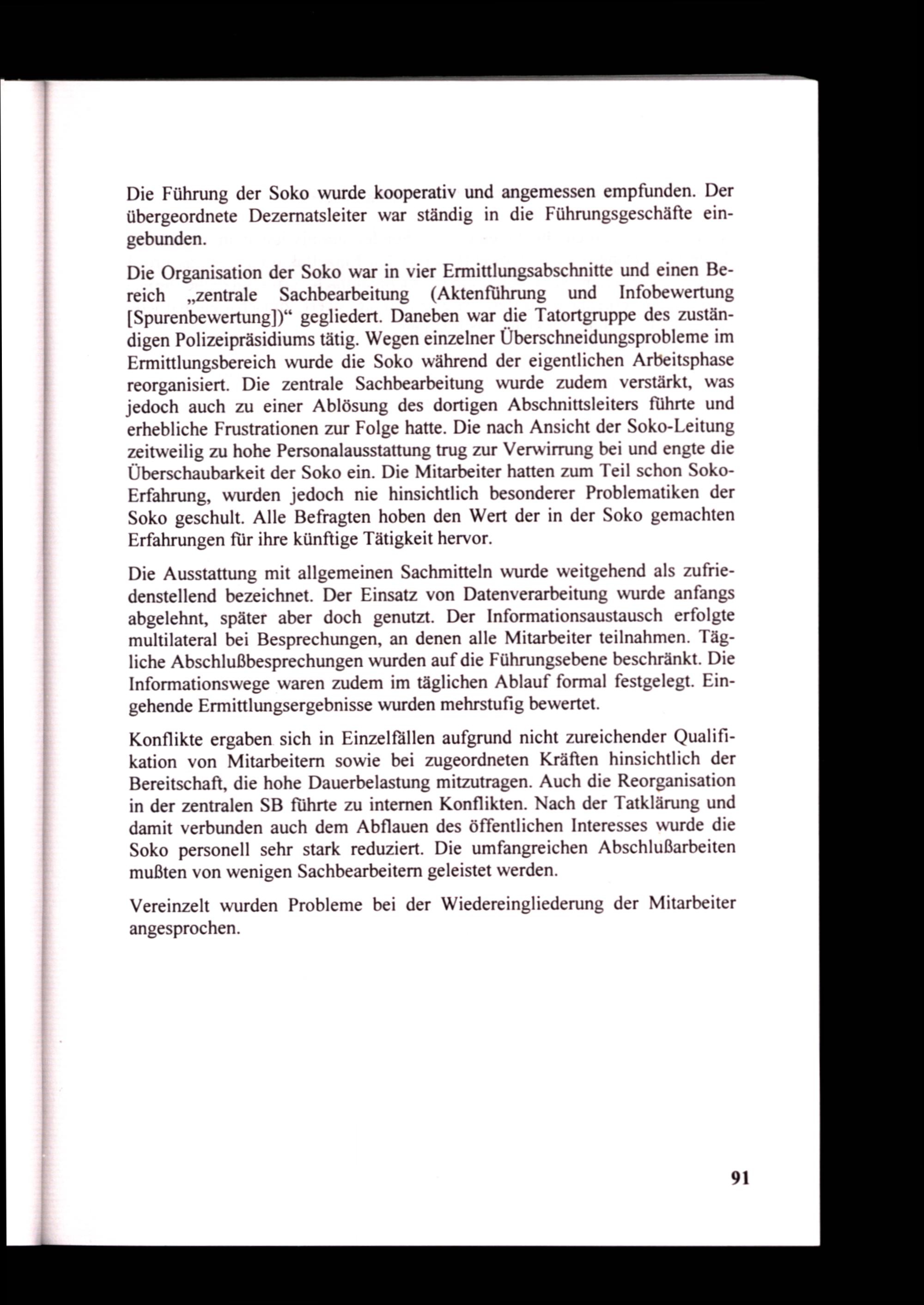Die Organisation der Soko war in vier Ermittlungsabschnitte und einen Bereich„zentrale Sachbearbeitung(Aktenführung und Infobewertung [Spurenbewertung])“ gegliedert. Daneben war die Tatortgruppe des zuständigen Polizeipräsidiums tätig. Wegen einzelner Überschneidungsprobleme im Ermittlungsbereich wurde die Soko während der eigentlichen Arbeitsphase reorganisiert. Die zentrale Sachbearbeitung wurde zudem verstärkt, was jedoch auch zu einer Ablösung des dortigen Abschnittsleiters führte und erhebliche Frustrationen zur Folge hatte. Die nach Ansicht der Soko-Leitung zeitweilig zu hohe Personalausstattung trug zur Verwirrung bei und engte die Überschaubarkeit der Soko ein. Die Mitarbeiter hatten zum Teil schon SokoErfahrung, wurden jedoch nie hinsichtlich besonderer Problematiken der Soko geschult. Alle Befragten hoben den Wert der in der Soko gemachten Erfahrungen für ihre künftige Tätigkeit hervor.