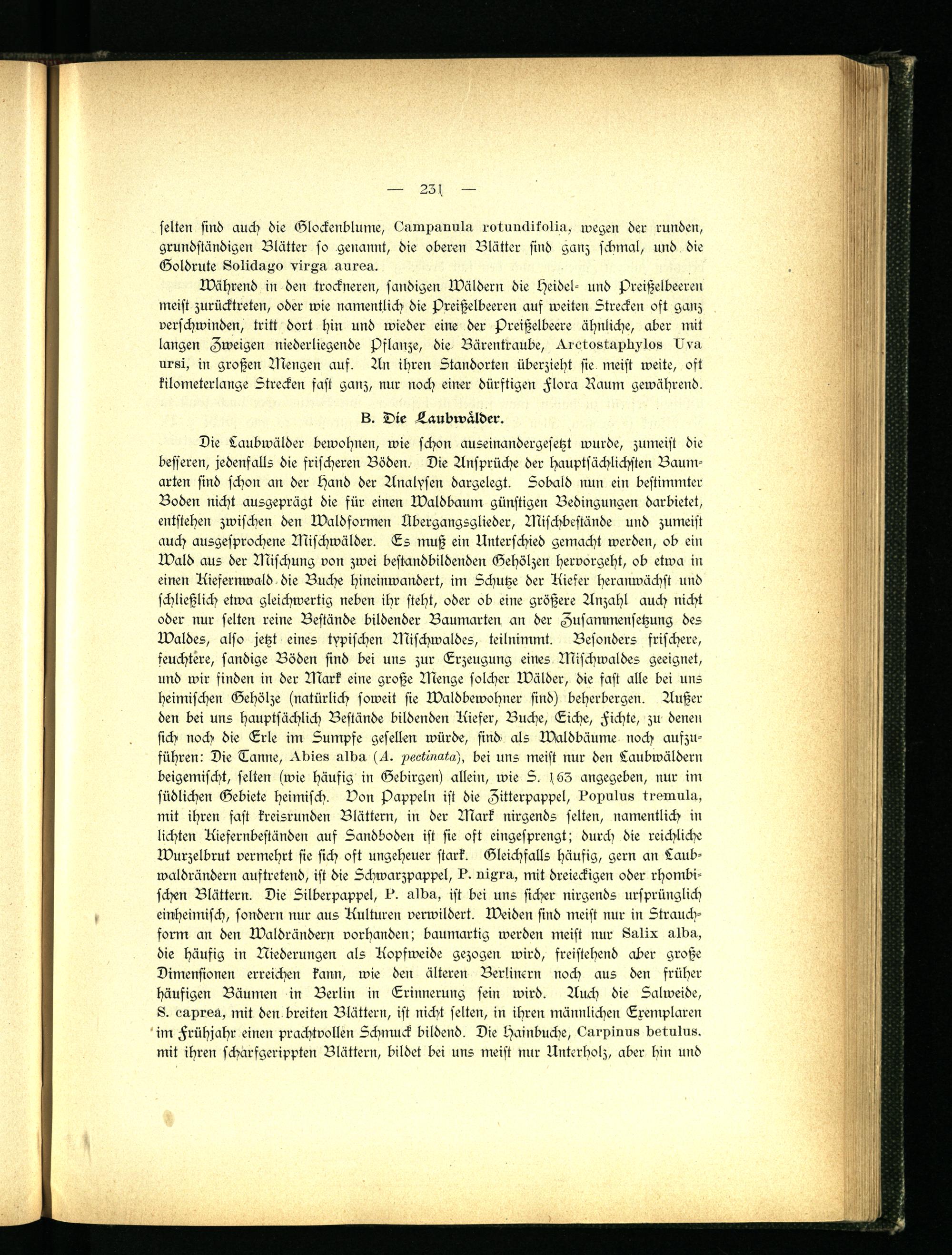 Die Laubwälder bewohnen, wie schon auseinandergesetzt wurde, zumeist die besseren, jedenfalls die frischeren Böden. Die Ansprüche der hauptsächlichsten Baumarten sind schon an der bland der Analysen dargelegt. Sobald nun ein bestimmter Boden nicht ausgeprägt die für einen Waldbaum günstigen Bedingungen darbietet, entstehen zwischen den Waldformen Ubergangsglieder, Mischbestände und zumeist auch ausgesprochene Mischwälder. Es muß ein Unterschied gemacht werden, ob ein Wald aus der Mischung von zwei bestandbildenden Gehölzen hervorgeht, ob etwa in einen Kiefernwald die Buche hineinwandert, im Schutze der Kiefer heranwächst und schließlich etwa gleichwertig neben ihr steht, oder ob eine größere Anzahl auch nicht oder nur selten reine Bestände bildender Baumarten an der Zusammensetzung des Waldes, also jetzt eines typischen Mischwaldes, teilnimmt. Besonders frischere, feuchtere, sandige Böden sind bei uns zur Erzeugung eines Mischwaldes geeignet, und wir finden in der Mark eine große Menge solcher Wälder, die fast alle bei uns heimischen Gehölze (natürlich soweit sie Waldbewohner sind) beherbergen. Außer den bei uns hauptsächlich Bestände bildenden Kiefer, Buche, Eiche, Fichte, zu denen sich noch die Erle im Sumpfe gesellen würde, sind als Waldbäume noch aufzuführen: Die Tanne, ^bi68 alba (ck. /leotrnata), bei uns meist nur den Laubwäldern beigemischt, selten (wie häufig in Gebirgen) allein, wie 5. s63 angegeben, nur im südlichen Gebiete heimisch. Von Pappeln ist die Zitterpappel, 8opnln8 Iromula, mit ihren fast kreisrunden Blättern, in der Mark nirgends selten, namentlich in lichten Kiefernbeständen auf Sandboden ist sie oft eingesprengt; durch die reichliche Wurzelbrut vermehrt sie sich oft ungeheuer stark. Gleichfalls häufig, gern an Laubwaldrändern auftretend, ist die Schwarzpappel, ?. niZra, mit dreieckigen oder rhombischen Blättern. Die Silberpappel, I'. nlba, ist bei uns sicher nirgends ursprünglich einheimisch, sondern nur aus Kulturen verwildert. Weiden sind meist nur in Strauchform an den Waldrändern vorhanden; baumartig werden meist nur 8nI1x alba, die häufig in Niederungen als Kopfweide gezogen wird, freistehend aber große Dimensionen erreichen kann, wie den älteren Berlinern noch aus den früher häufigen Bäumen in Berlin in Erinnerung sein wird. Auch die Salweide, 8. enprsL, mit den breiten Blättern, ist nicht selten, in ihren männlichen Exemplaren 'im Frühjahr einen prachtvollen Schmuck bildend. Die painbuche, 6nrpinn8 belnbw. mit ihren scharfgerippten Blättern, bildet bei uns meist nur Unterbolz, aber bin und
