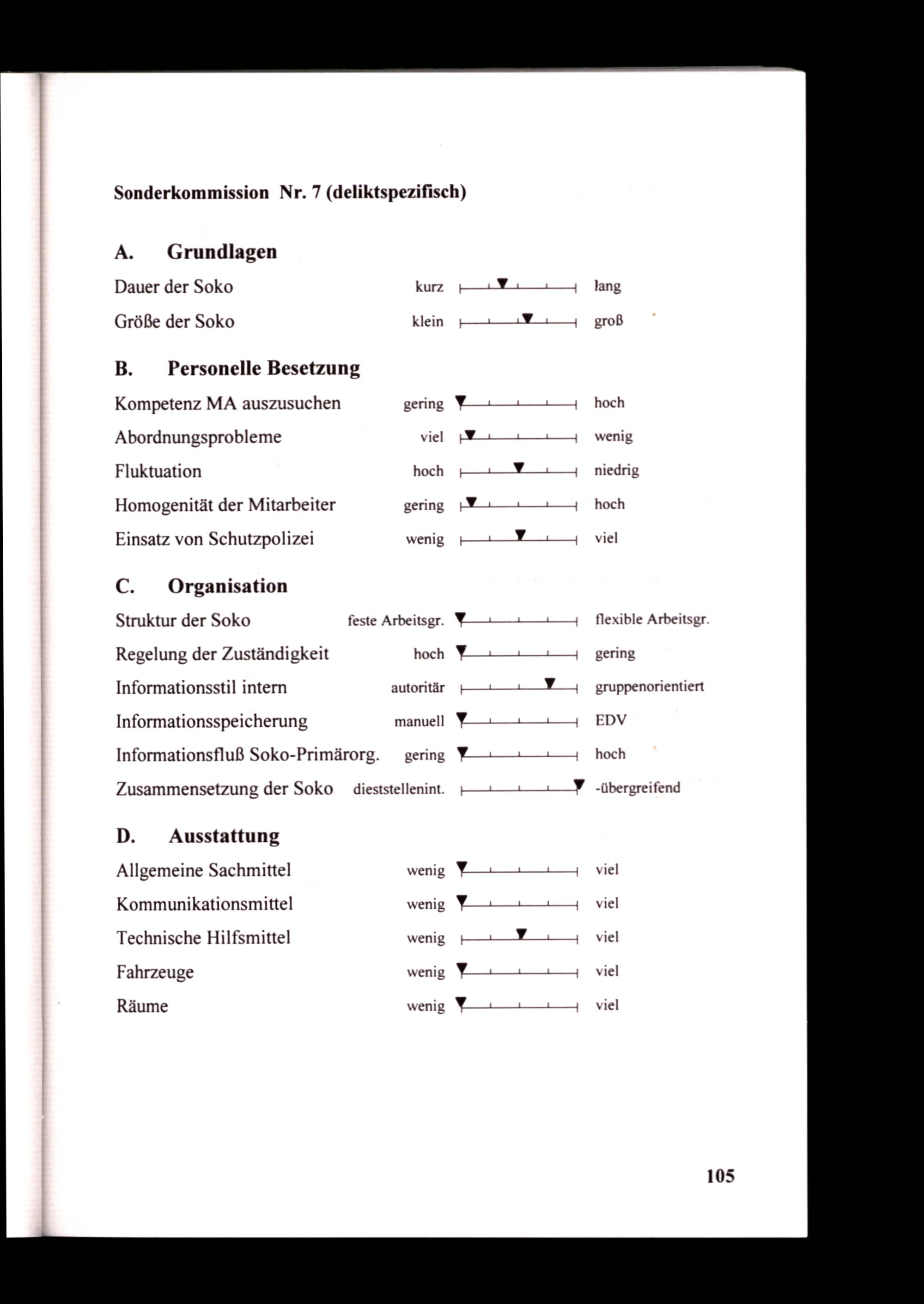 Struktur der Soko feste Arbeitsgr. Y_——ı———ı— Regelung der Zuständigkeit hoch Yu—ı u y Informationsstil intern autoritär——— WW} Informationsspeicherung manuell Yırı mi Informationsfluß Soko-Primärorg. gering Y—ı—mı Zusammensetzung der Soko dieststellenint.———— YW D. Ausstattung