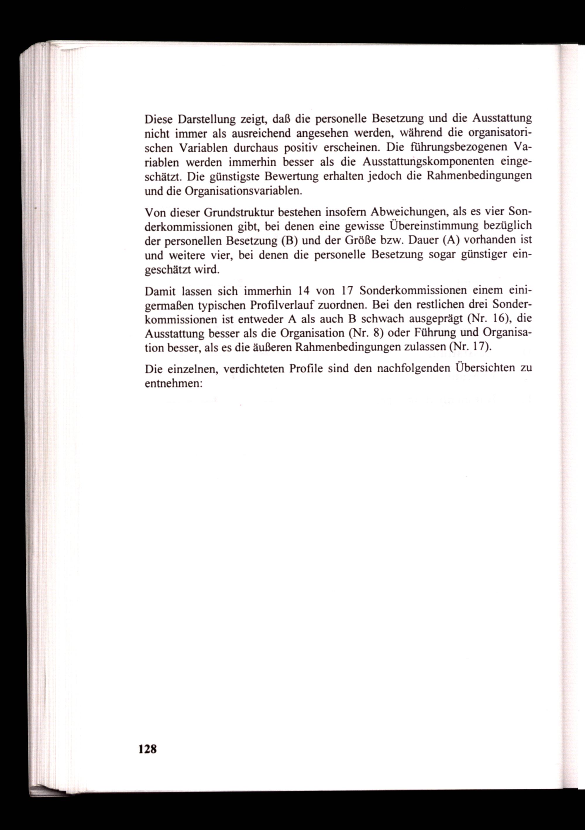 Damit lassen sich immerhin 14 von 17 Sonderkommissionen einem einigermaßen typischen Profilverlauf zuordnen. Bei den restlichen drei Sonderkommissionen ist entweder A als auch B schwach ausgeprägt(Nr. 16), die Ausstattung besser als die Organisation(Nr. 8) oder Führung und Organisation besser, als es die äußeren Rahmenbedingungen zulassen(Nr. 17).