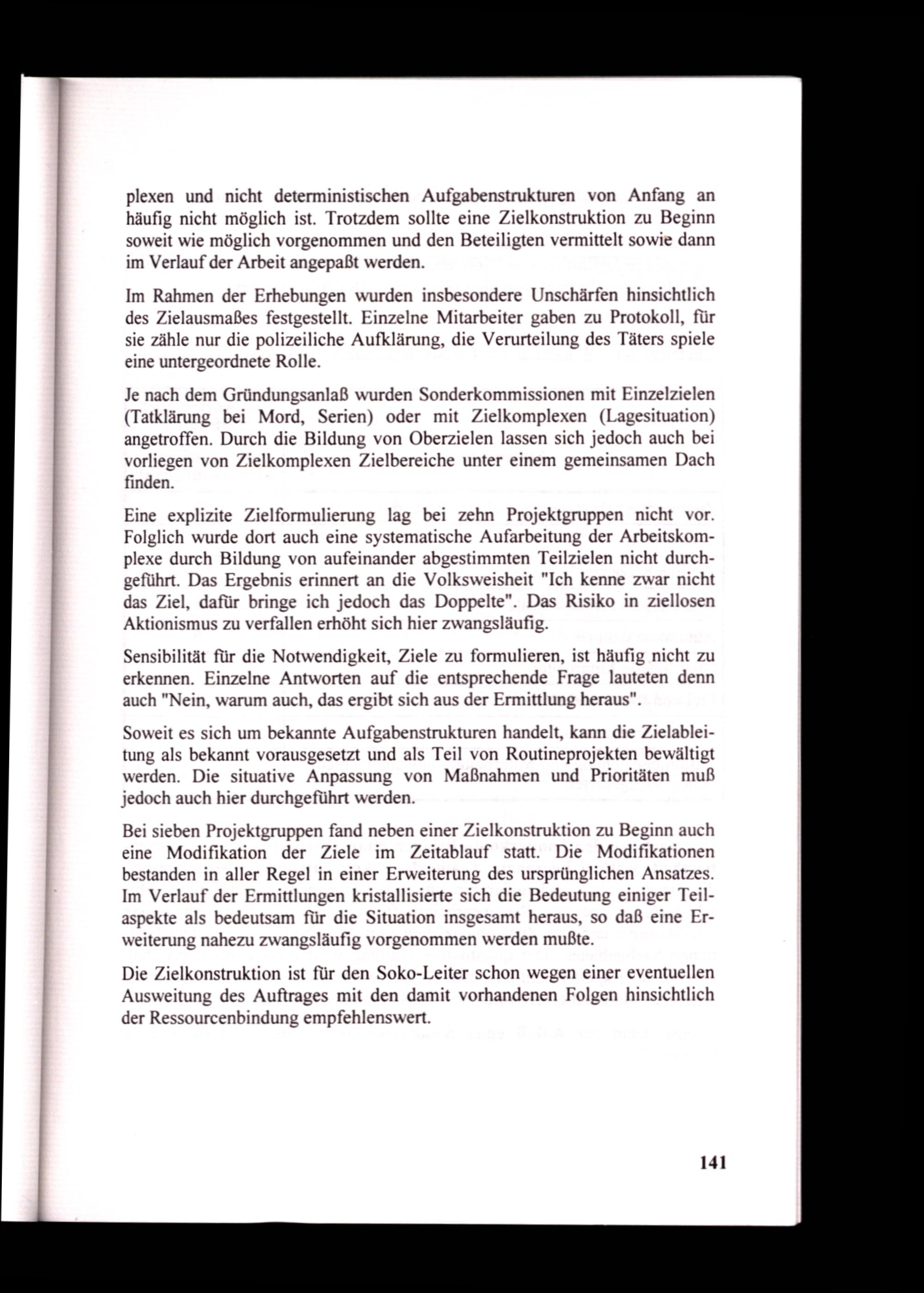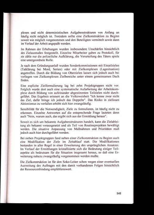 Je nach dem Gründungsanlaß wurden Sonderkommissionen mit Einzelzielen (Tatklärung bei Mord, Serien) oder mit Zielkomplexen(Lagesituation) angetroffen. Durch die Bildung von Oberzielen lassen sich jedoch auch bei vorliegen von Zielkomplexen Zielbereiche unter einem gemeinsamen Dach finden.