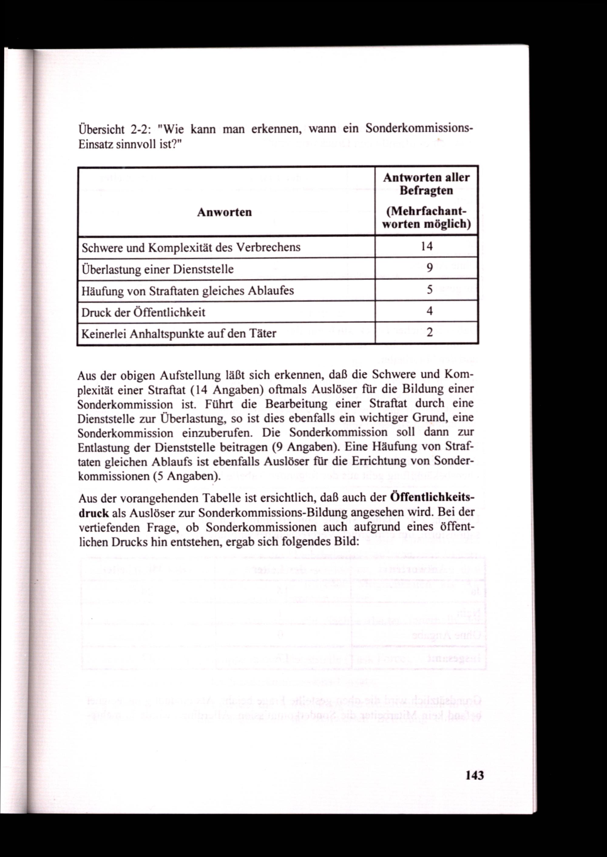 Aus der obigen Aufstellung läßt sich erkennen, daß die Schwere und Komplexität einer Straftat(14 Angaben) oftmals Auslöser für die Bildung einer Sonderkommission ist. Führt die Bearbeitung einer Straftat durch eine Dienststelle zur Überlastung, so ist dies ebenfalls ein wichtiger Grund, eine Sonderkommission einzuberufen. Die Sonderkommission soll dann zur Entlastung der Dienststelle beitragen(9 Angaben). Eine Häufung von Straftaten gleichen Ablaufs ist ebenfalls Auslöser für die Errichtung von Sonderkommissionen(5 Angaben).