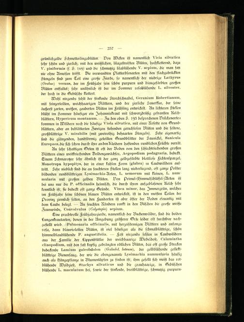 grünlichgelbe Schmetterlingsblülen. Von Wicken ist namentlich Hin silvntlen sehr schön und zierlich, mit den weißlichen, lilagestreiften Blüten, hochkletternd, dazu V. ximkormis (s. S. töß) und die schmutzig lilablühende V. 8opium, die man fast nie ohne Ameisen trifft. Die verwandten Platterbsenarten mit den flachgedrückten Stengeln sind zum Teil eine große Zierde, so namentlich der niedrige Inrtbznm« (0,-odu«) V6rmi8, der im Frühjahr sein schön purpurn und blaugefärbten großen Blüten entfaltet; sehr unähnlich ist der im Sommer rosablühende I--. silvestsr, der hoch in die Gebüsche klettert.