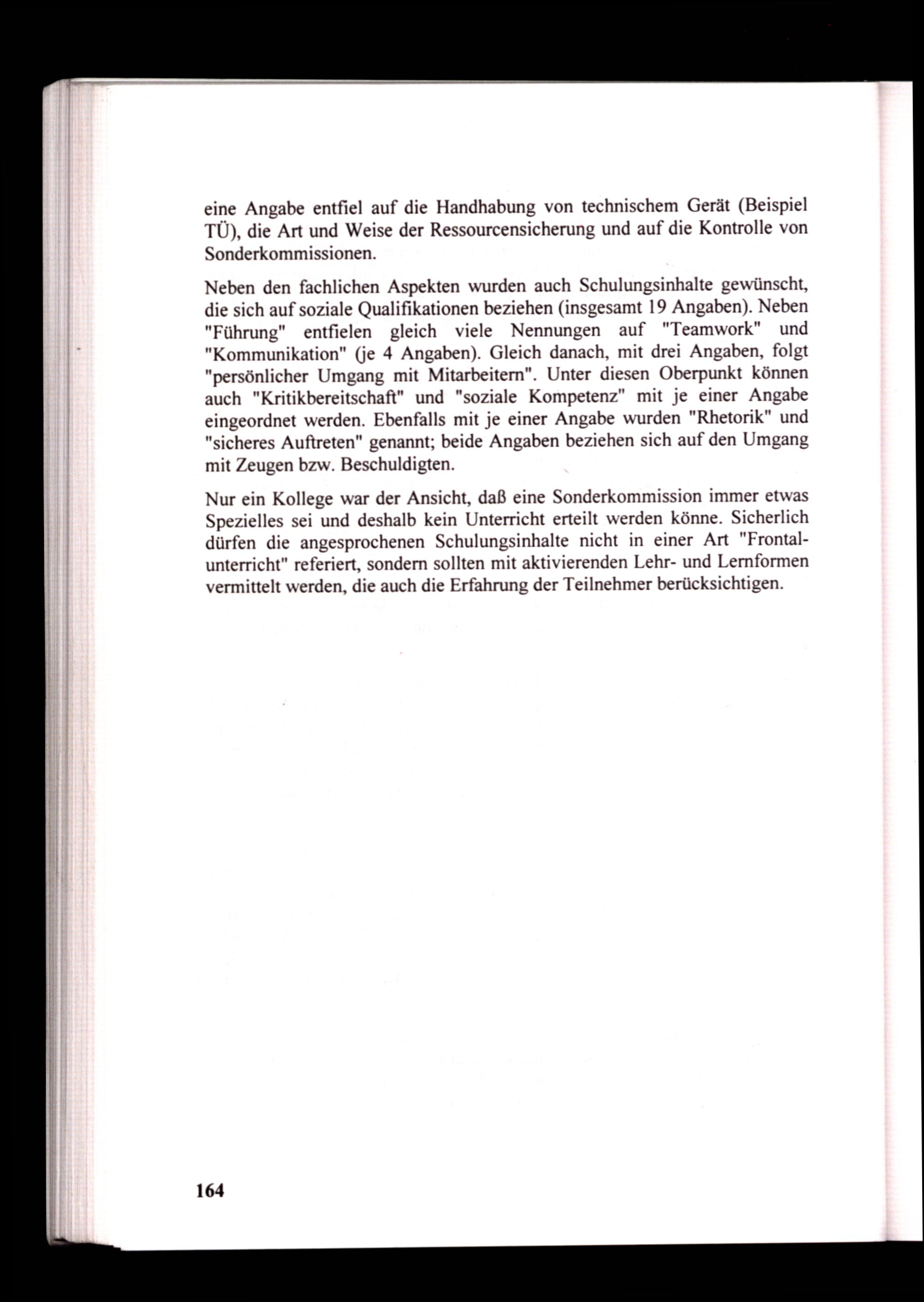 Nur ein Kollege war der Ansicht, daß eine Sonderkommission immer etwas Spezielles sei und deshalb kein Unterricht erteilt werden könne. Sicherlich dürfen die angesprochenen Schulungsinhalte nicht in einer Art"Frontalunterricht" referiert, sondern sollten mit aktivierenden Lehr- und Lernformen vermittelt werden, die auch die Erfahrung der Teilnehmer berücksichtigen.