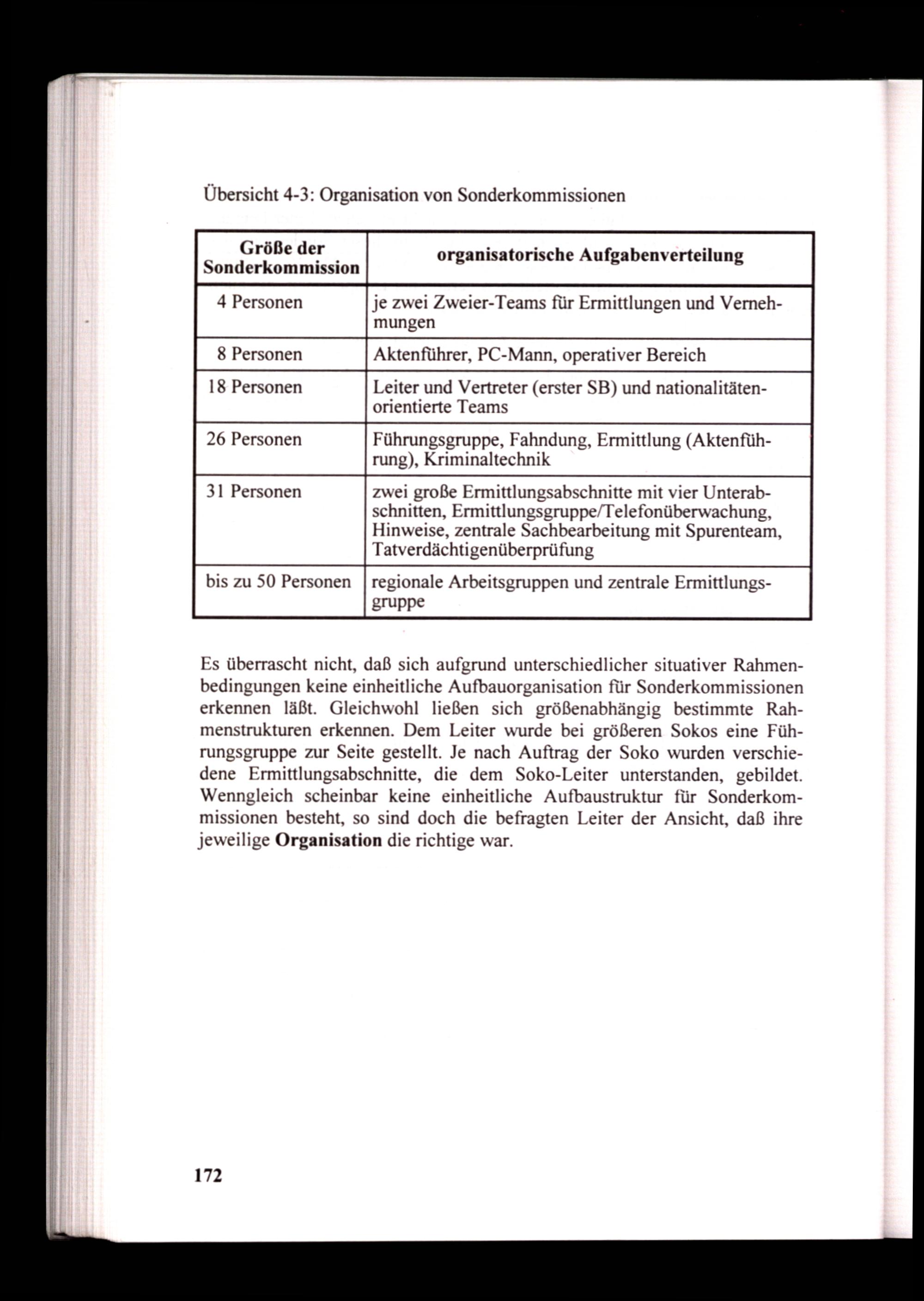 Es überrascht nicht, daß sich aufgrund unterschiedlicher situativer Rahmenbedingungen keine einheitliche Aufbauorganisation für Sonderkommissionen erkennen läßt. Gleichwohl ließen sich größenabhängig bestimmte Rahmenstrukturen erkennen. Dem Leiter wurde bei größeren Sokos eine Führungsgruppe zur Seite gestellt. Je nach Auftrag der Soko wurden verschiedene Ermittlungsabschnitte, die dem Soko-Leiter unterstanden, gebildet. Wenngleich scheinbar keine einheitliche Aufbaustruktur für Sonderkommissionen besteht, so sind doch die befragten Leiter der Ansicht, daß ihre jeweilige Organisation die richtige war.