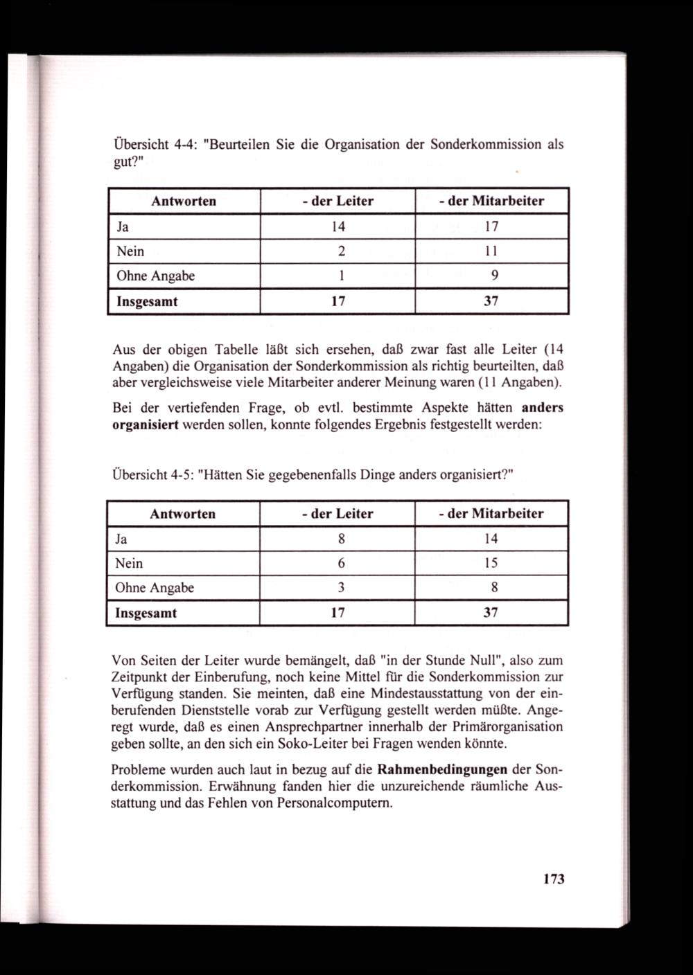 Aus der obigen Tabelle läßt sich ersehen, daß zwar fast alle Leiter(14 Angaben) die Organisation der Sonderkommission als richtig beurteilten, daß aber vergleichsweise viele Mitarbeiter anderer Meinung waren(11 Angaben).