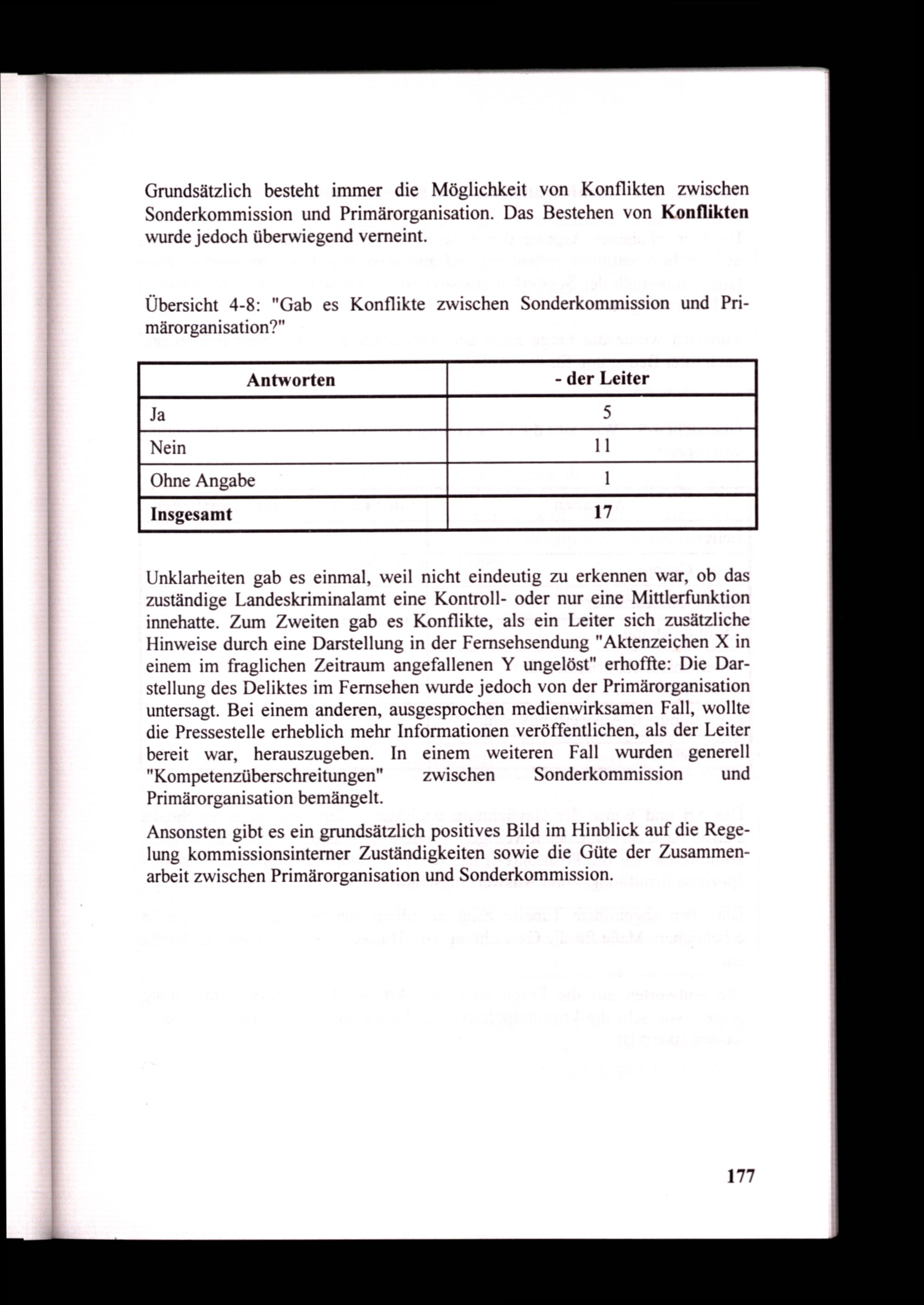 Grundsätzlich besteht immer die Möglichkeit von Konflikten zwischen Sonderkommission und Primärorganisation. Das Bestehen von Konflikten wurde jedoch überwiegend verneint.