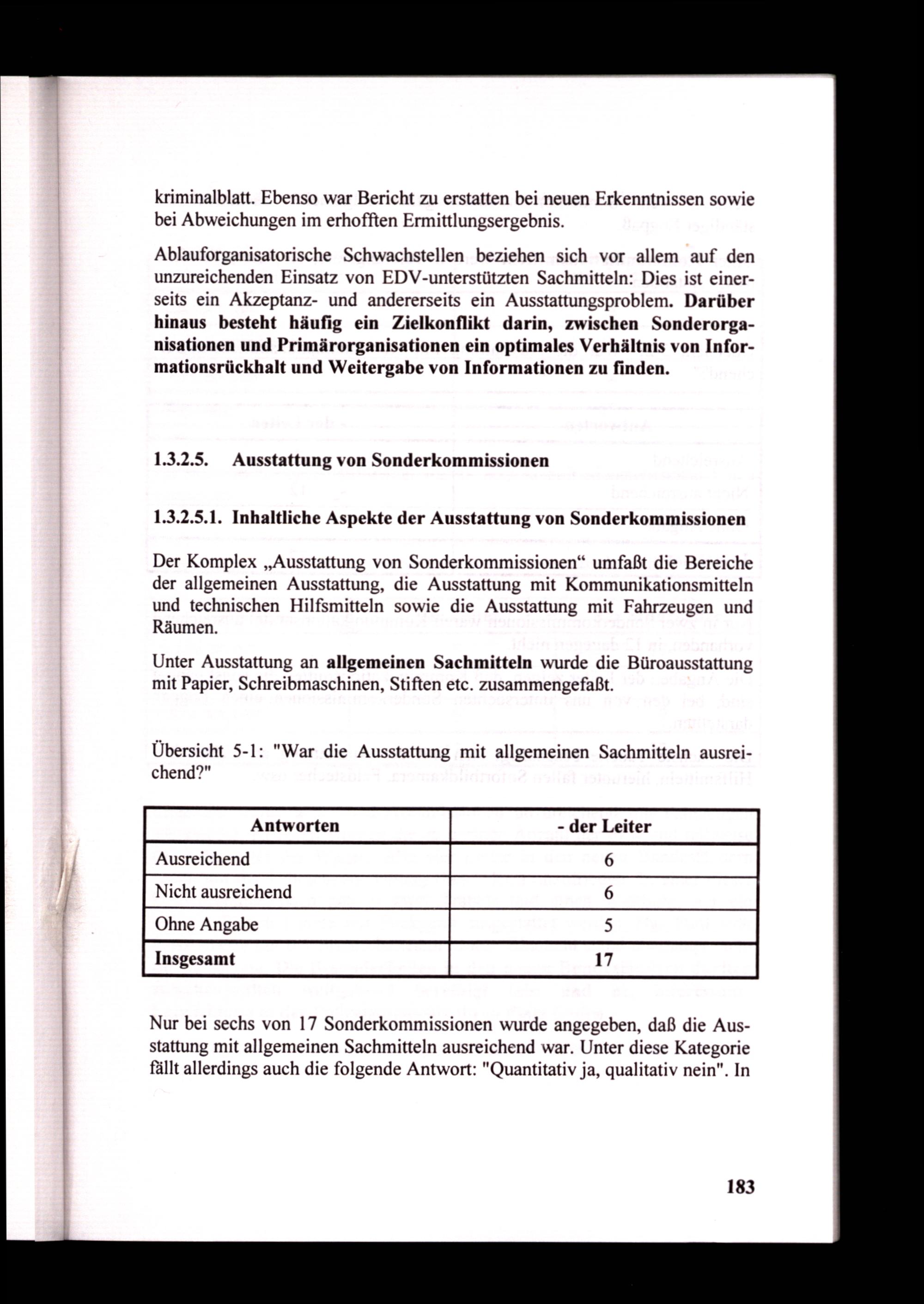 Nur bei sechs von 17 Sonderkommissionen wurde angegeben, daß die Ausstattung mit allgemeinen Sachmitteln ausreichend war. Unter diese Kategorie fällt allerdings auch die folgende Antwort:"Quantitativ ja, qualitativ nein". In