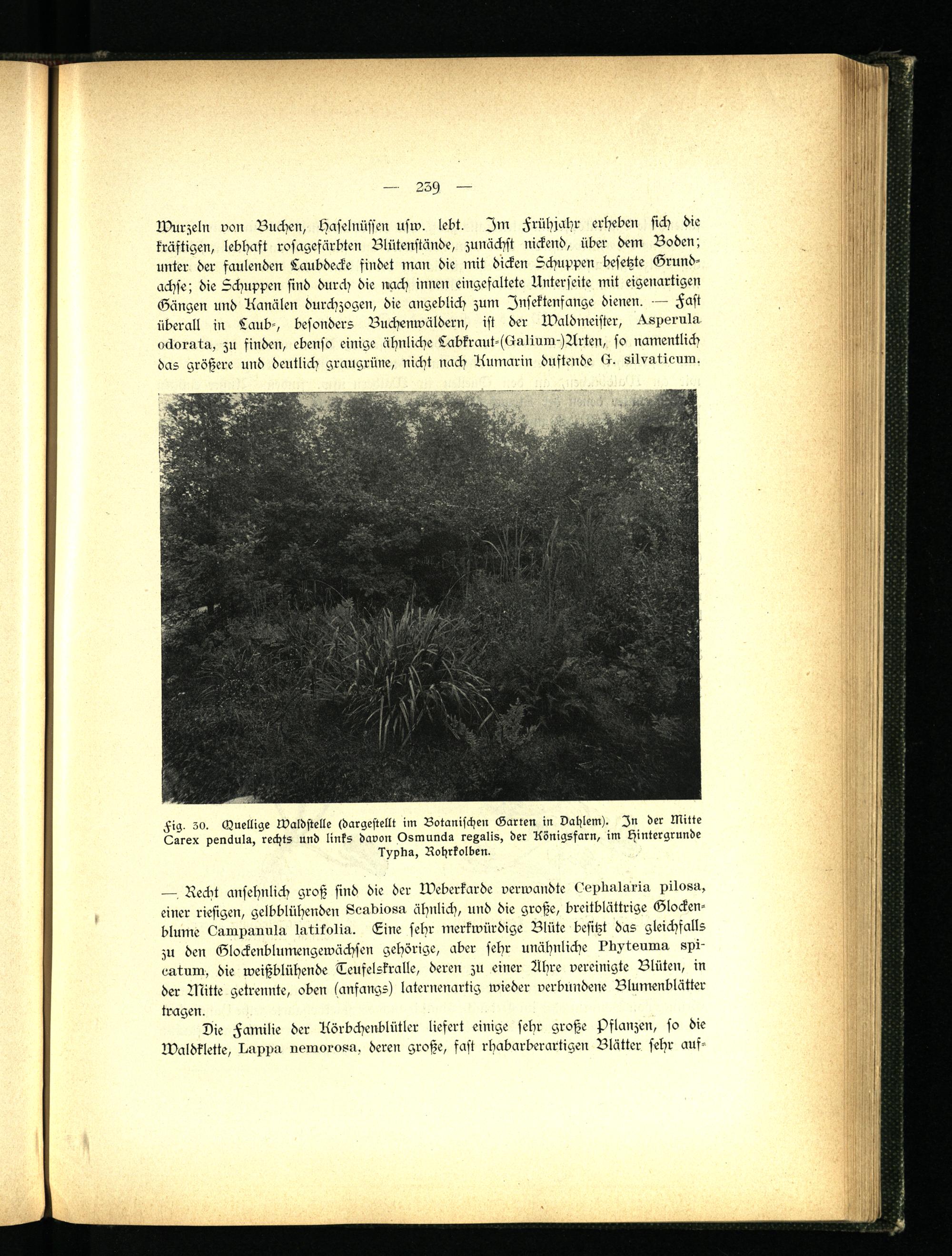 Fig. so. Guellige tvaldstelle (dargestellt im Botanischen Garten in Oahlem). In der Mitte Qarex penäuls, rechts und links davon Osmunäs rexalis, der Königsfarn, im Hintergründe