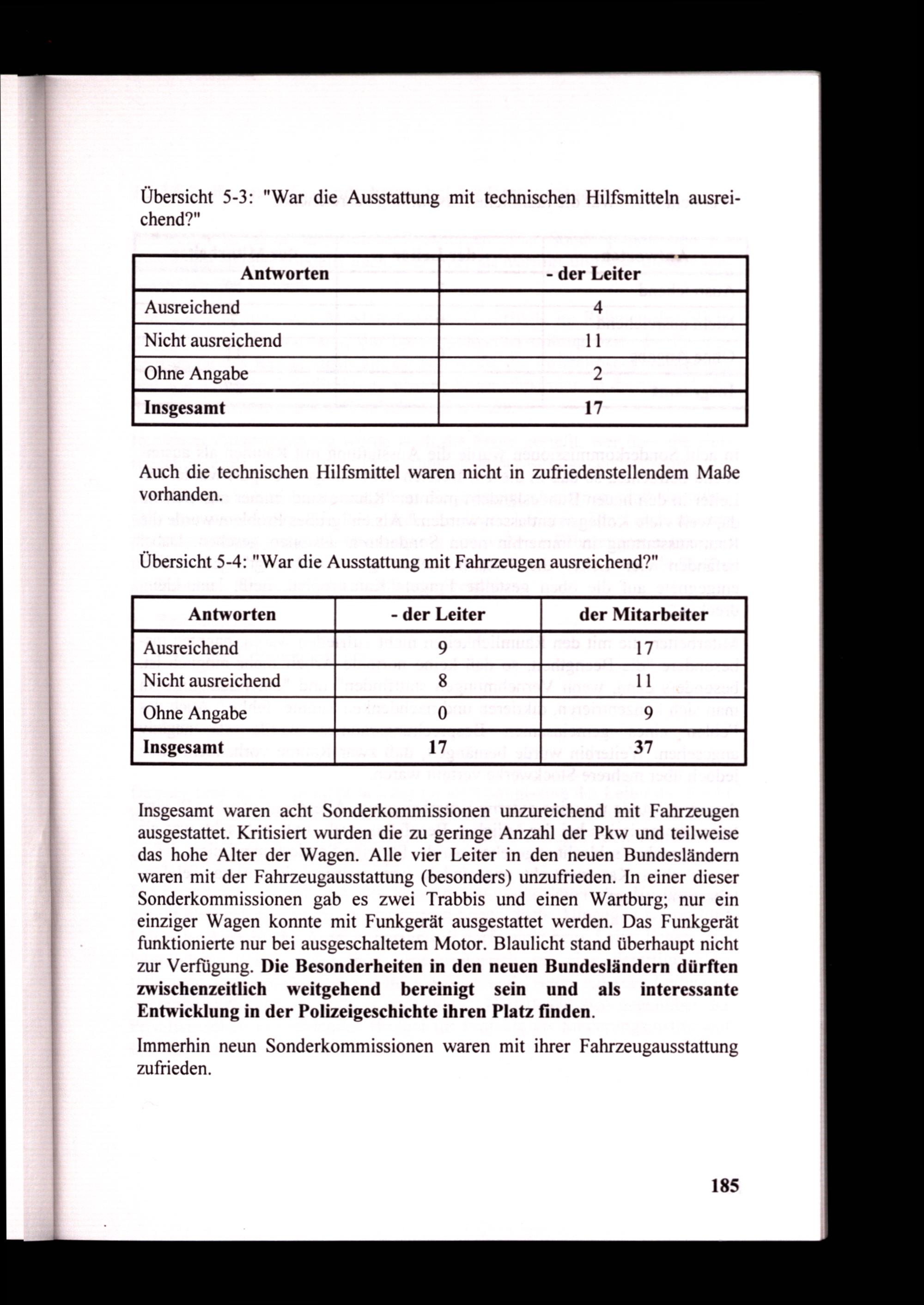Insgesamt waren acht Sonderkommissionen unzureichend mit Fahrzeugen ausgestattet. Kritisiert wurden die zu geringe Anzahl der Pkw und teilweise das hohe Alter der Wagen. Alle vier Leiter in den neuen Bundesländern waren mit der Fahrzeugausstattung(besonders) unzufrieden. In einer dieser Sonderkommissionen gab es zwei Trabbis und einen Wartburg; nur ein einziger Wagen konnte mit Funkgerät ausgestattet werden. Das Funkgerät funktionierte nur bei ausgeschaltetem Motor. Blaulicht stand überhaupt nicht zur Verfügung. Die Besonderheiten in den neuen Bundesländern dürften zwischenzeitlich weitgehend bereinigt sein und als interessante Entwicklung in der Polizeigeschichte ihren Platz finden.