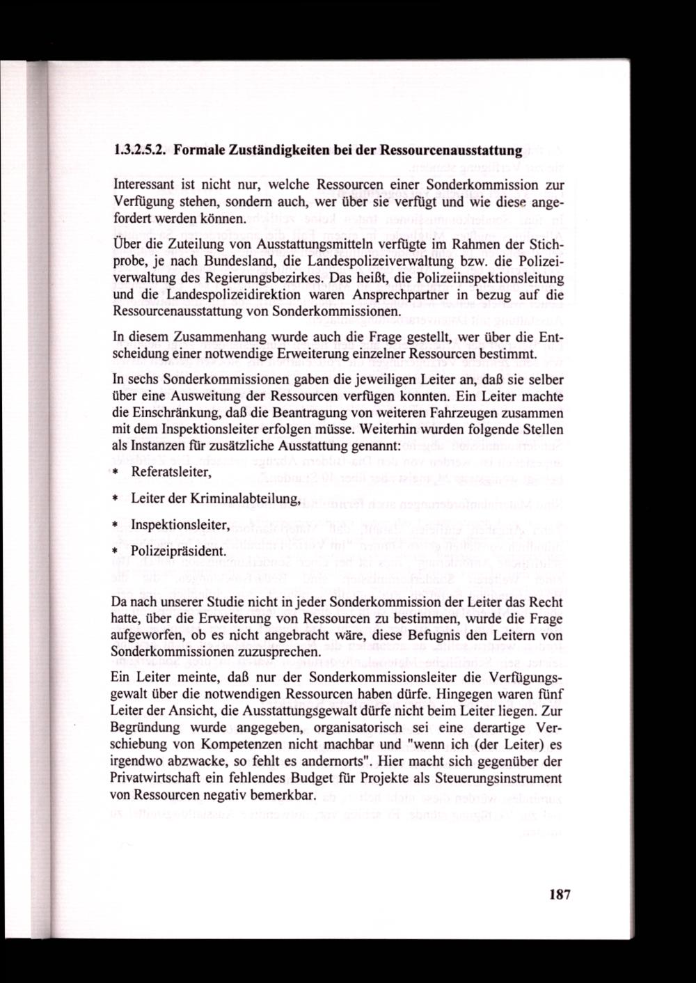 Über die Zuteilung von Ausstattungsmitteln verfügte im Rahmen der Stichprobe, je nach Bundesland, die Landespolizeiverwaltung bzw. die Polizeiverwaltung des Regierungsbezirkes. Das heißt, die Polizeiinspektionsleitung und die Landespolizeidirektion waren Ansprechpartner in bezug auf die Ressourcenausstattung von Sonderkommissionen.