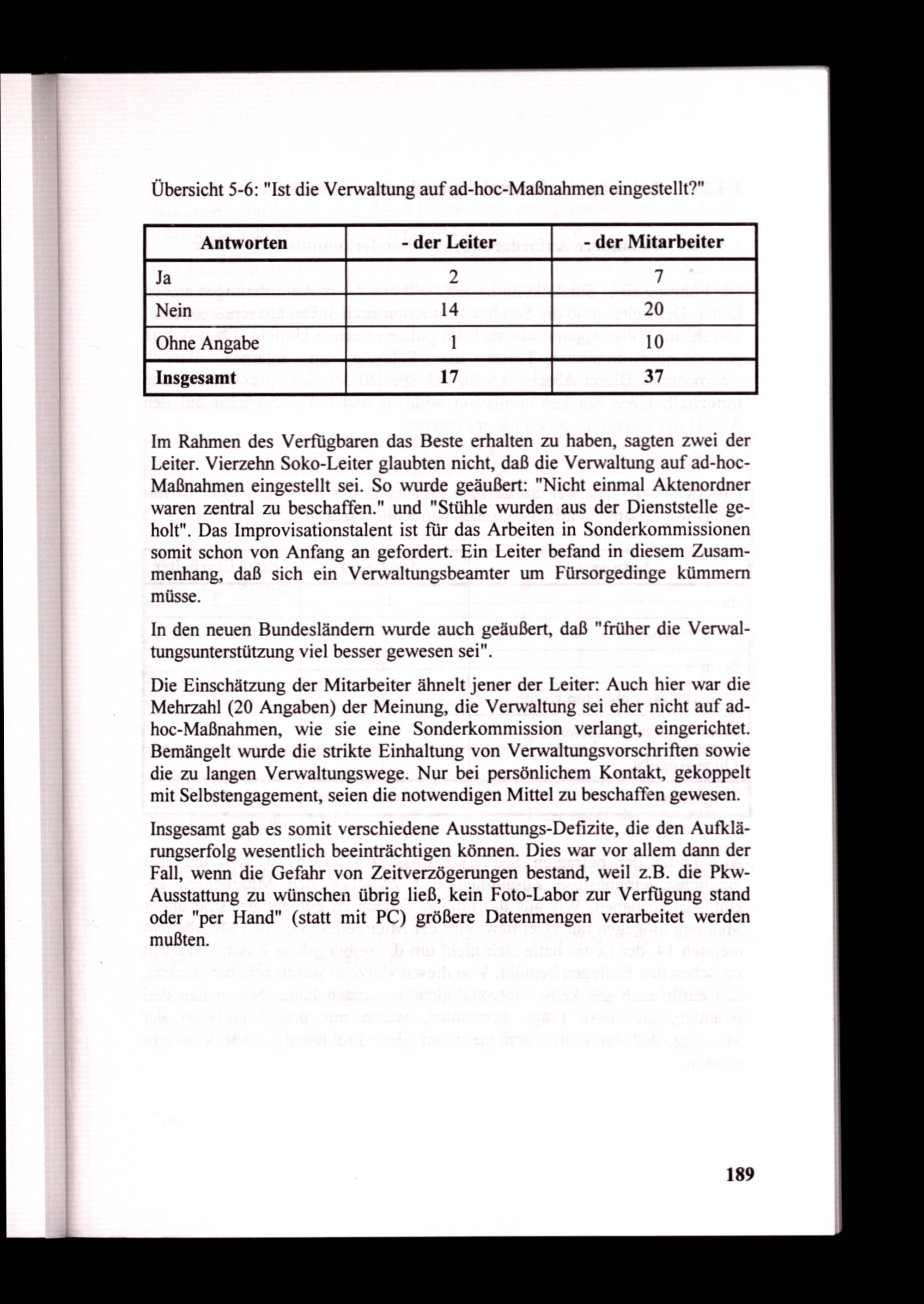 Die Einschätzung der Mitarbeiter ähnelt jener der Leiter: Auch hier war die Mehrzahl(20 Angaben) der Meinung, die Verwaltung sei eher nicht auf adhoc-Maßnahmen, wie sie eine Sonderkommission verlangt, eingerichtet. Bemängelt wurde die strikte Einhaltung von Verwaltungsvorschriften sowie die zu langen Verwaltungswege. Nur bei persönlichem Kontakt, gekoppelt mit Selbstengagement, seien die notwendigen Mittel zu beschaffen gewesen.