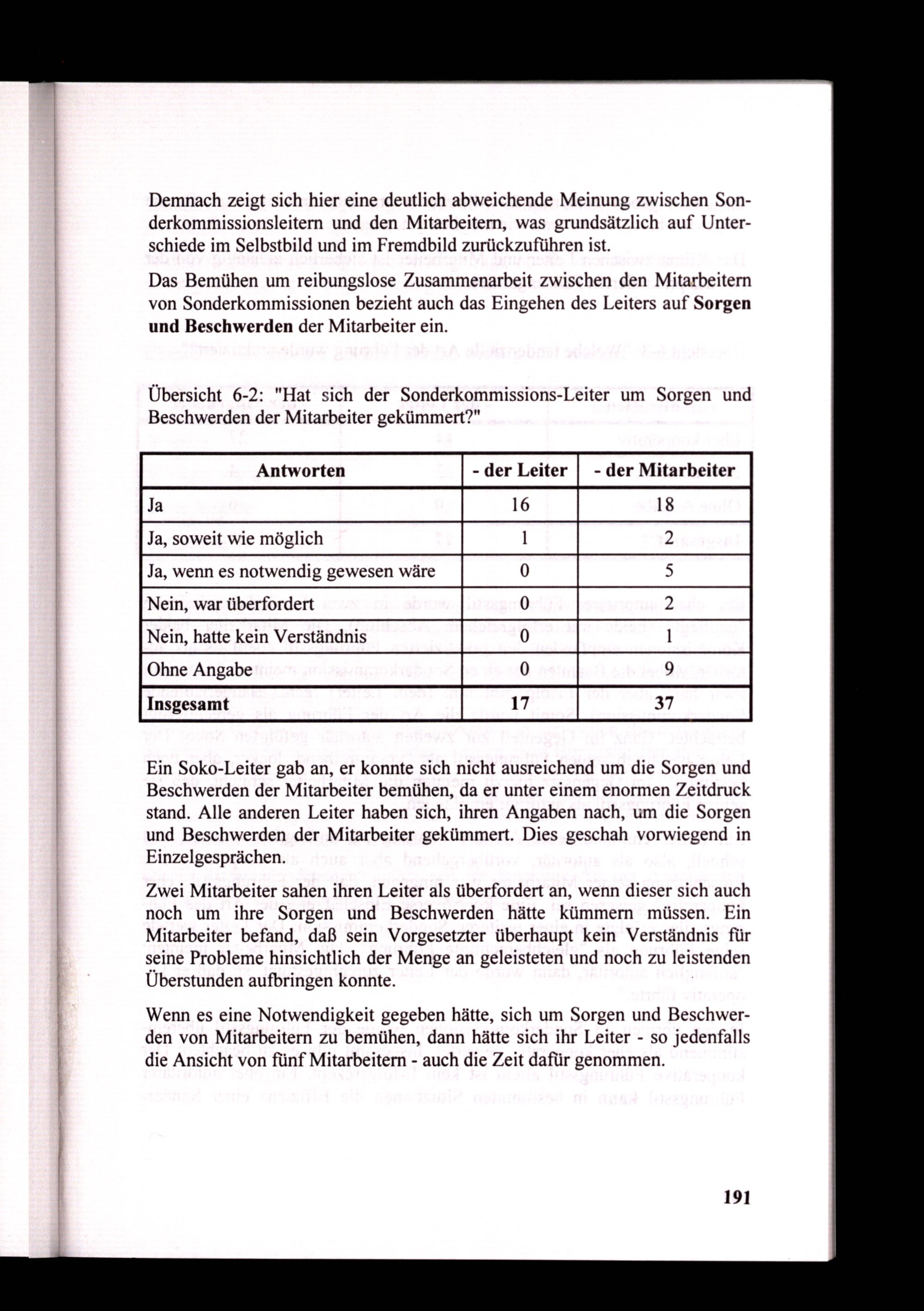 Demnach zeigt sich hier eine deutlich abweichende Meinung zwischen Sonderkommissionsleitern und den Mitarbeitern, was grundsätzlich auf Unterschiede im Selbstbild und im Fremdbild zurückzuführen ist.