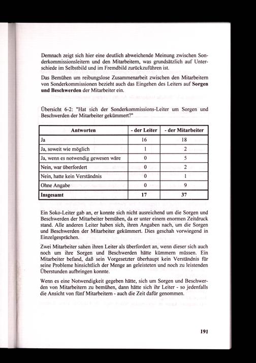 Das Bemühen um reibungslose Zusammenarbeit zwischen den Mitarbeitern von Sonderkommissionen bezieht auch das Eingehen des Leiters auf Sorgen und Beschwerden der Mitarbeiter ein.