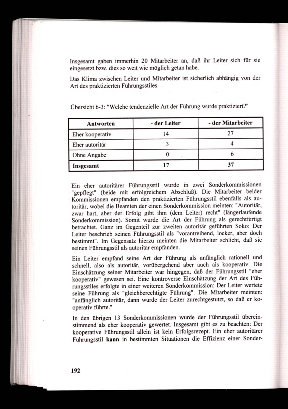Ein Leiter empfand seine Art der Führung als anfänglich rationell und schnell, also als autoritär, vorübergehend aber auch ais kooperativ. Die Einschätzung seiner Mitarbeiter war hingegen, daß der Führungsstil"eher kooperativ” gewesen sei. Eine kontroverse Einschätzung der Art des Führungsstiles erfolgte in einer weiteren Sonderkommission: Der Leiter wertete seine Führung als"gleichberechtigte Führung". Die Mitarbeiter meinten: "anfänglich autoritär, dann wurde der Leiter zurechtgestutzt, so daß er kooperativ führte."