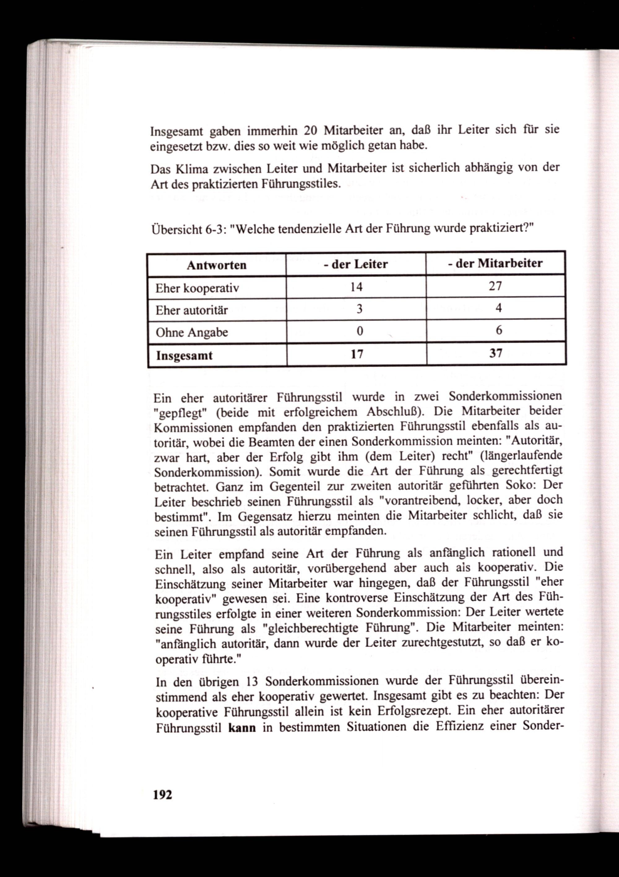In den übrigen 13 Sonderkommissionen wurde der Führungsstil übereinstimmend als eher kooperativ gewertet. Insgesamt gibt es zu beachten: Der kooperative Führungsstil allein ist kein Erfolgsrezept. Ein eher autoritärer Führungsstil kann in bestimmten Situationen die Effizienz einer Sonder