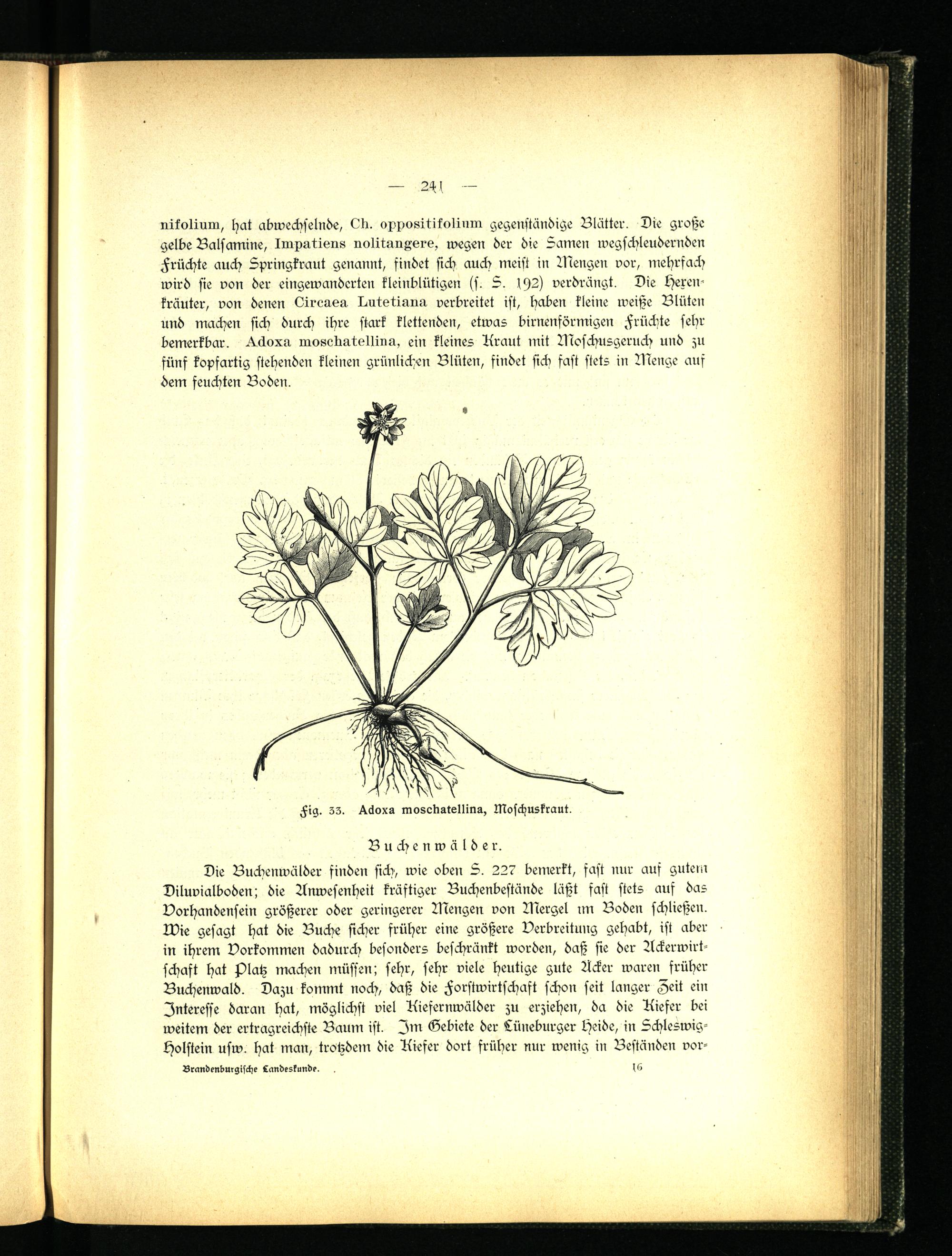 nikoliuiu, hat abwechselnde, Lk. oxpositikolinm gegenständige Blätter. Die große gelbe Balsamine, Impmtmus uotitrruKtzre, wegen der die Samen wegschleudernden Früchte auch Springkraut genannt, findet sich auch meist in Mengen vor, mehrfach wird sie von der eingewanderten kleinblütigen ss. S. lst2) verdrängt. Die Hexenkräuter, von denen 6irerma Imtstäuun verbreitet ist, haben kleine weiße Blüten und machen sich durch ihre stark klettenden, etwas birnenförmigen Früchte sehr bemerkbar, ^ckoxu urosedutelliim, ein kleines Kraut mit Moschusgeruch und zu fünf kopsartig stehenden kleinen grünlichen Blüten, findet sich fast stets in Menge aus dem feuchten Boden.