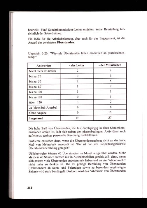 Die hohe Zahl von Überstunden, die fast durchgängig in allen Sonderkommissionen anfällt ist, läßt sich neben den phasenbedingten Aktivitäten auch auf eine zu geringe personelle Besetzung zurück führen.