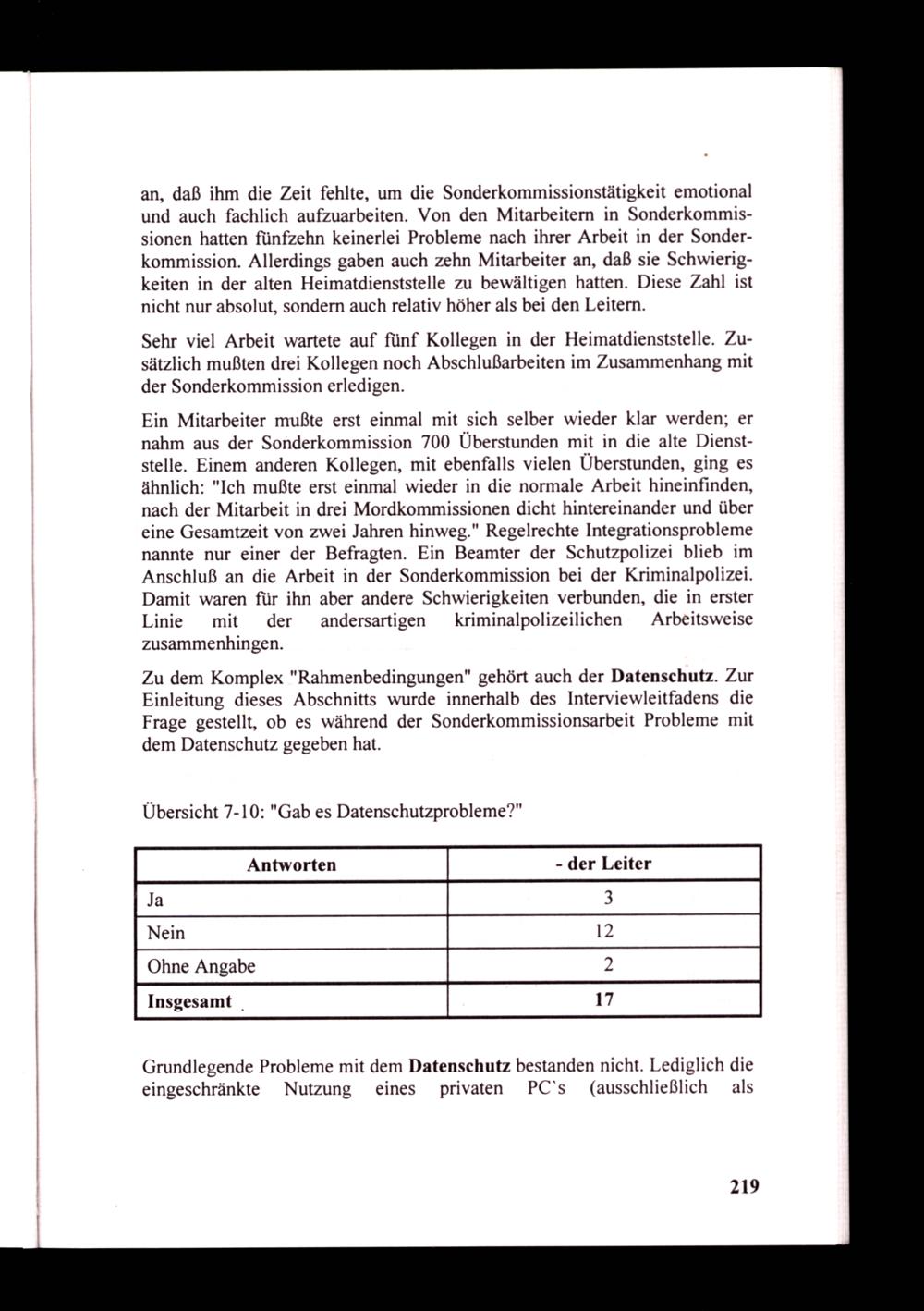 Ein Mitarbeiter mußte erst einmal mit sich selber wieder klar werden; er nahm aus der Sonderkommission 700 Überstunden mit in die alte Dienststelle. Einem anderen Kollegen, mit ebenfalls vielen Überstunden, ging es ähnlich:"Ich mußte erst einmal wieder in die normale Arbeit hineinfinden, nach der Mitarbeit in drei Mordkommissionen dicht hintereinander und über eine Gesamtzeit von zwei Jahren hinweg." Regelrechte Integrationsprobleme nannte nur einer der Befragten. Ein Beamter der Schutzpolizei blieb im Anschluß an die Arbeit in der Sonderkommission bei der Kriminalpolizei. Damit waren für ihn aber andere Schwierigkeiten verbunden, die in erster Linie mit der_andersartigen kriminalpolizeilichen Arbeitsweise zusammenhingen.