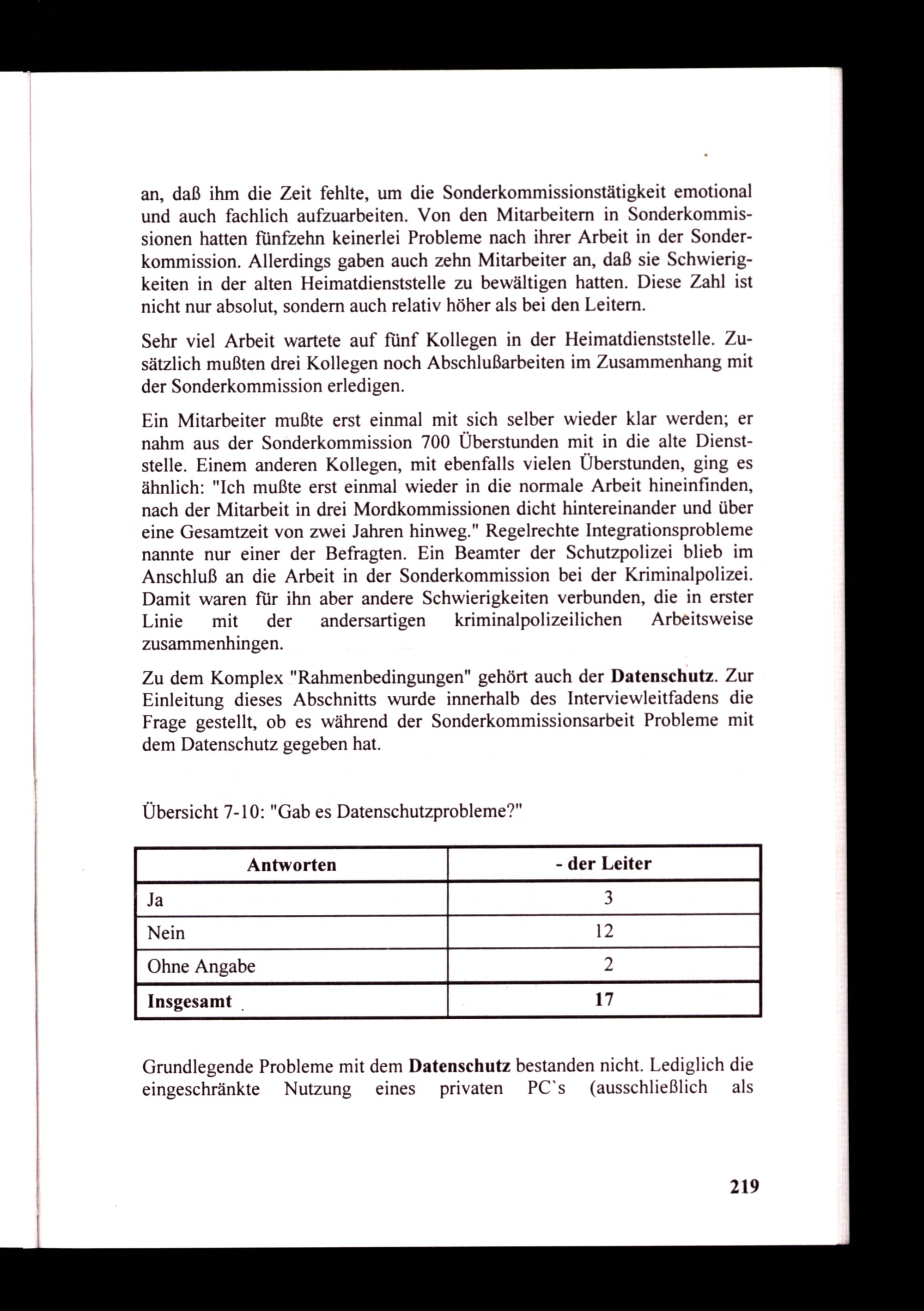 Zu dem Komplex"Rahmenbedingungen" gehört auch der Datenschutz. Zur Einleitung dieses Abschnitts wurde innerhalb des Interviewleitfadens die Frage gestellt, ob es während der Sonderkommissionsarbeit Probleme mit dem Datenschutz gegeben hat.