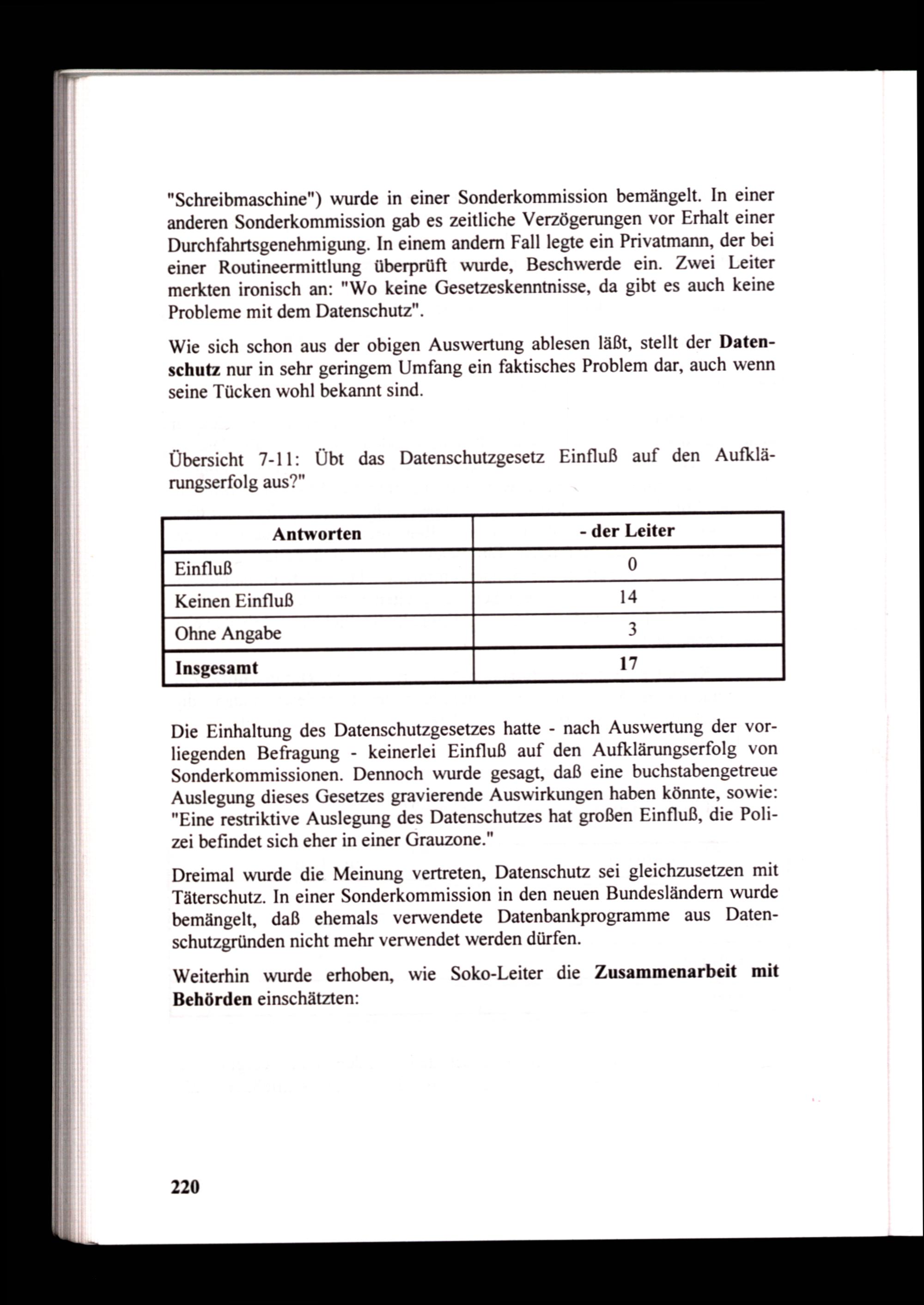 Die Einhaltung des Datenschutzgesetzes hatte- nach Auswertung der vorliegenden Befragung- keinerlei Einfluß auf den Aufklärungserfolg von Sonderkommissionen. Dennoch wurde gesagt, daß eine buchstabengetreue Auslegung dieses Gesetzes gravierende Auswirkungen haben könnte, sowie: "Eine restriktive Auslegung des Datenschutzes hat großen Einfluß, die Polizei befindet sich eher in einer Grauzone."