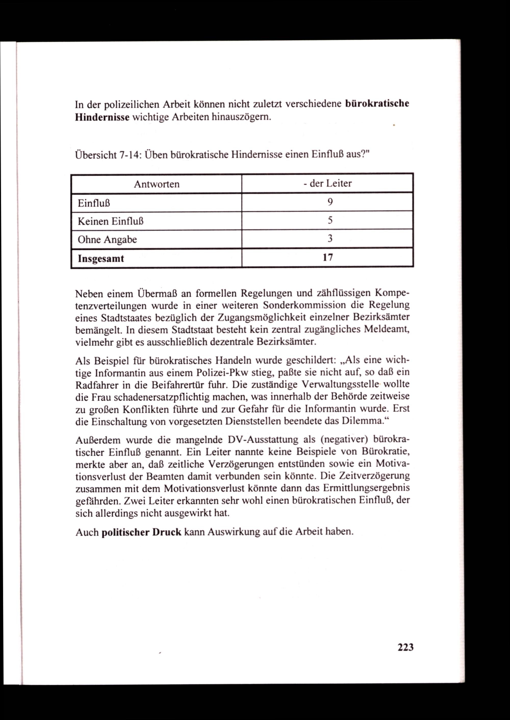 Außerdem wurde die mangelnde DV-Ausstattung als(negativer) bürokratischer Einfluß genannt. Ein Leiter nannte keine Beispiele von Bürokratie, merkte aber an, daß zeitliche Verzögerungen entstünden sowie ein Motivationsverlust der Beamten damit verbunden sein könnte. Die Zeitverzögerung zusammen mit dem Motivationsverlust könnte dann das Ermittlungsergebnis gefährden. Zwei Leiter erkannten sehr wohl einen bürokratischen Einfluß, der sich allerdings nicht ausgewirkt hat.