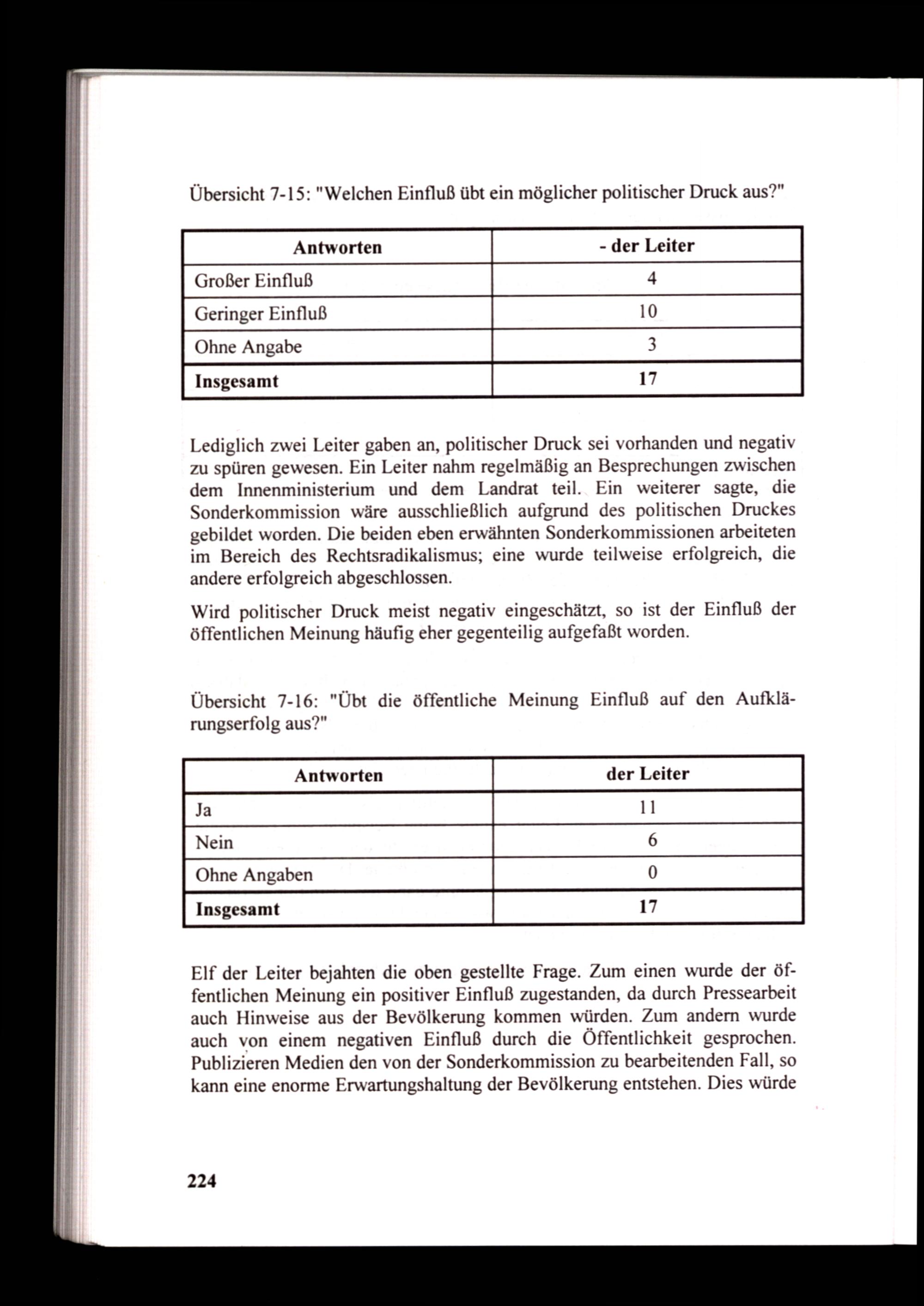 Lediglich zwei Leiter gaben an, politischer Druck sei vorhanden und negativ zu spüren gewesen. Ein Leiter nahm regelmäßig an Besprechungen zwischen dem Innenministerium und dem Landrat teil. Ein weiterer sagte, die Sonderkommission wäre ausschließlich aufgrund des politischen Druckes gebildet worden. Die beiden eben erwähnten Sonderkommissionen arbeiteten im Bereich des Rechtsradikalismus; eine wurde teilweise erfolgreich, die andere erfolgreich abgeschlossen.