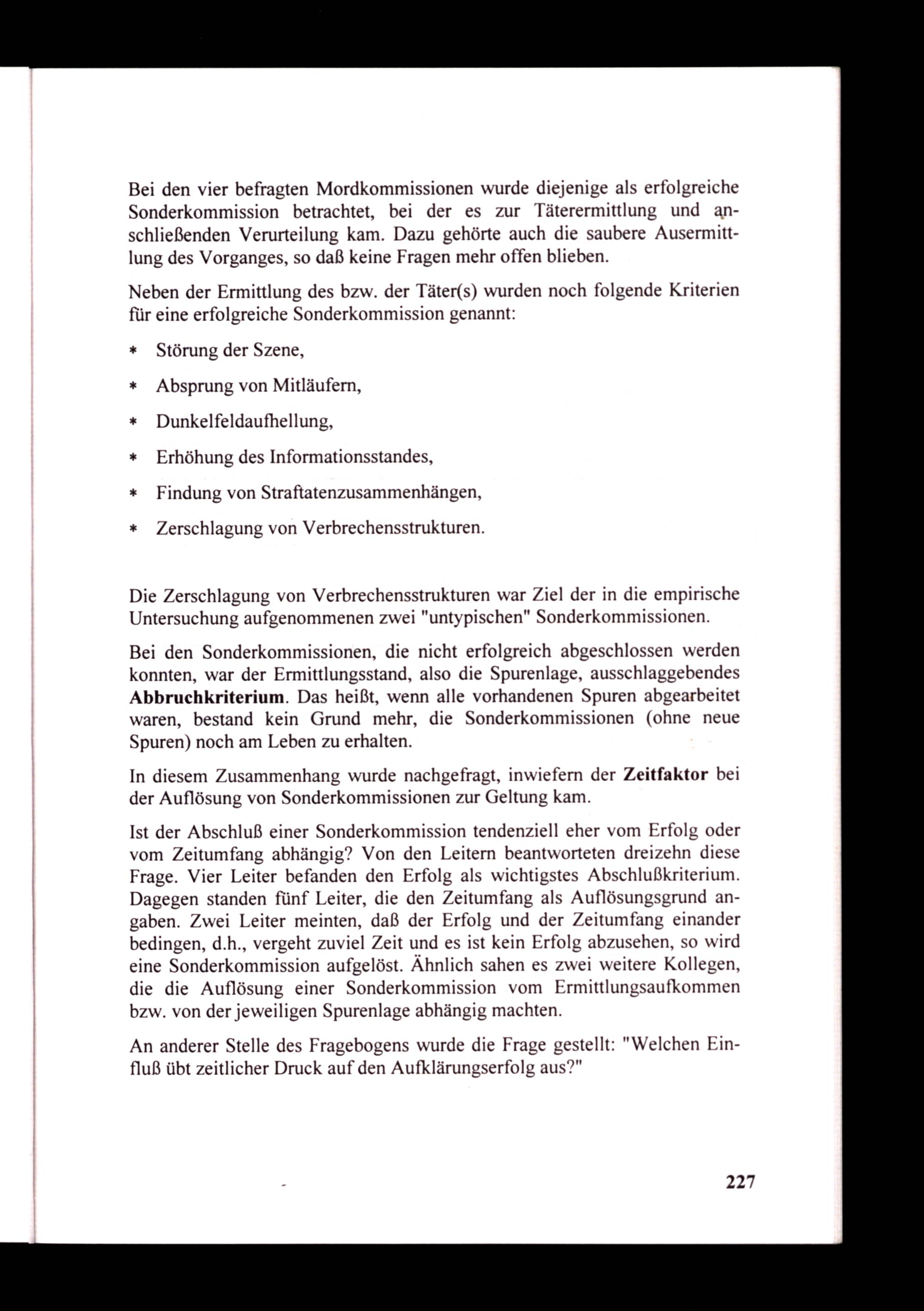 Bei den vier befragten Mordkommissionen wurde diejenige als erfolgreiche Sonderkommission betrachtet, bei der es zur Täterermittlung und anschließenden Verurteilung kam. Dazu gehörte auch die saubere Ausermittlung des Vorganges, so daß keine Fragen mehr offen blieben.