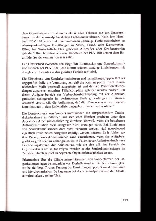 Die Einrichtung von Sonderkommissionen und Ermittlungsgruppen läßt als ungeprüftes Indiz die Vermutung zu, daß die Kriminalpolizei nicht in ausreichendem Maße personell ausgerüstet ist und deshalb Prioritätsentscheidungen zugunsten einzelner Fälle/Komplexe gebildet werden müssen, um diesen Aufgabenbereich der Verbrechensbekämpfung mit der Aufbauorganisation sachgerecht im vorhandenen Umfang bewältigen zu können. Matussek vertritt z.B. die Auffassung, daß die„Dauerexistenz von Sonderkommissionen... dem Rationalisierungsgebot zuwider laufen würde.“