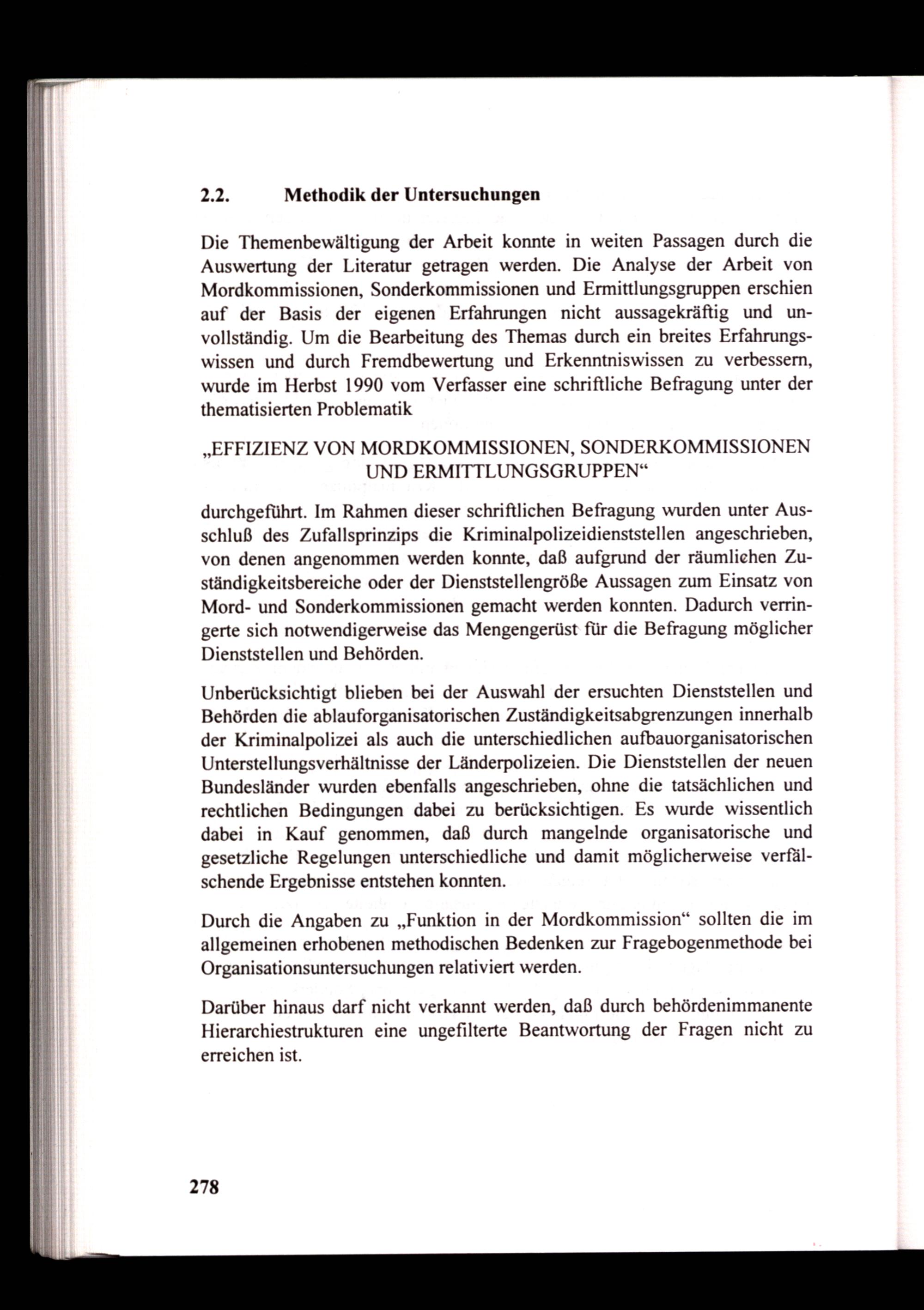 Die Themenbewältigung der Arbeit konnte in weiten Passagen durch die Auswertung der Literatur getragen werden. Die Analyse der Arbeit von Mordkommissionen, Sonderkommissionen und Ermittlungsgruppen erschien auf der Basis der eigenen Erfahrungen nicht aussagekräftig und unvollständig. Um die Bearbeitung des Themas durch ein breites Erfahrungswissen und durch Fremdbewertung und Erkenntniswissen zu verbessern, wurde im Herbst 1990 vom Verfasser eine schriftliche Befragung unter der thematisierten Problematik