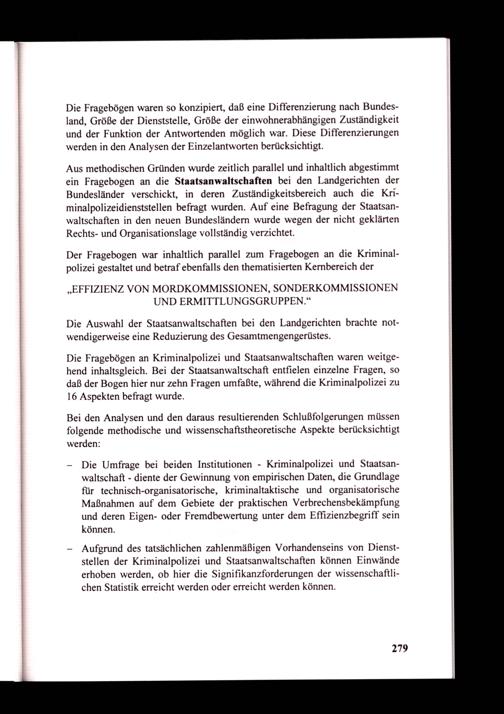— Die Umfrage bei beiden Institutionen- Kriminalpolizei und Staatsanwaltschaft- diente der Gewinnung von empirischen Daten, die Grundlage für technisch-organisatorische, kriminaltaktische und organisatorische Maßnahmen auf dem Gebiete der praktischen Verbrechensbekämpfung und deren Eigen- oder Fremdbewertung unter dem Effizienzbegriff sein können.