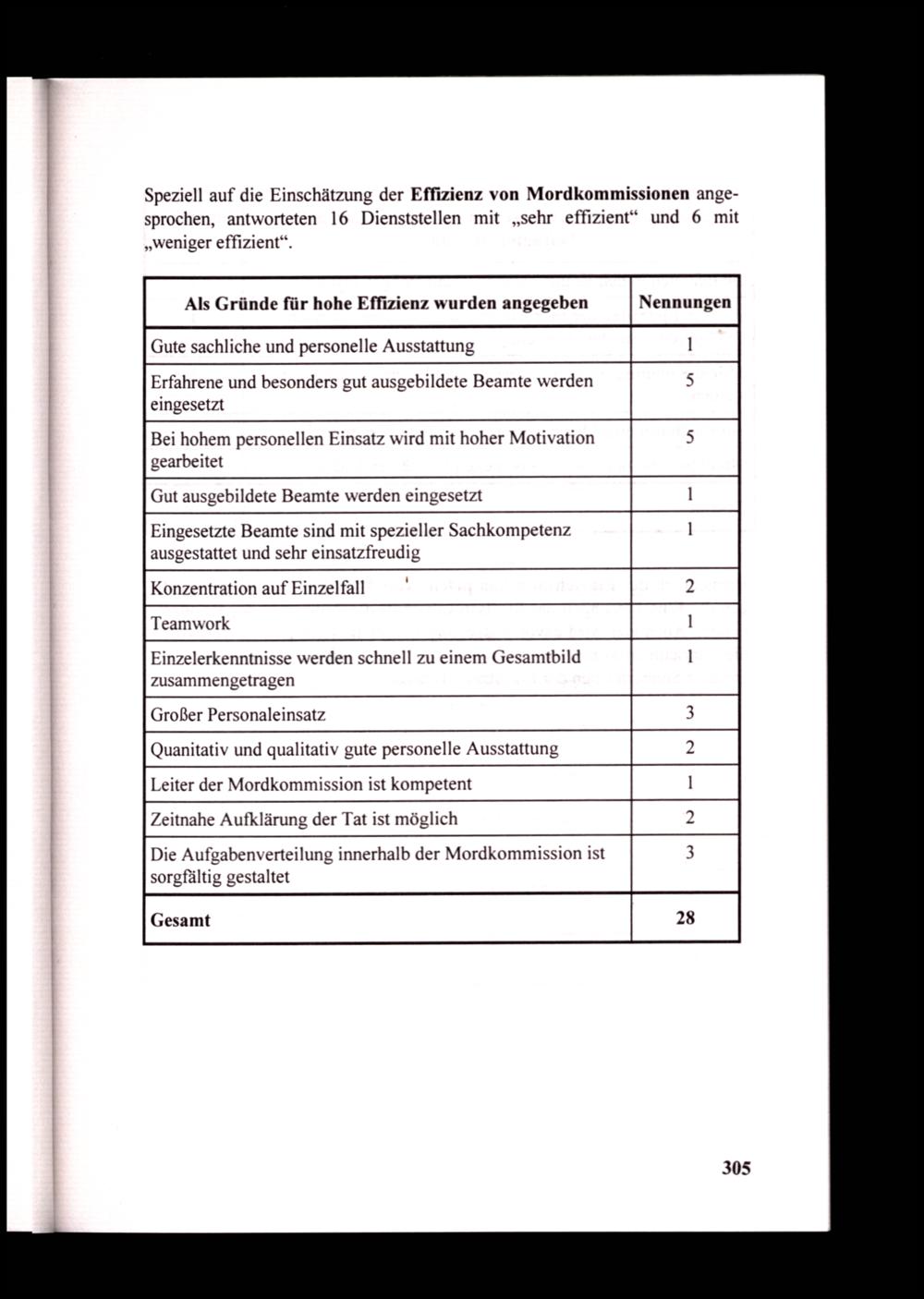 Speziell auf die Einschätzung der Effizienz von Mordkommissionen angesprochen, antworteten 16 Dienststellen mit„sehr effizient“ und 6 mit „weniger effizient“.
