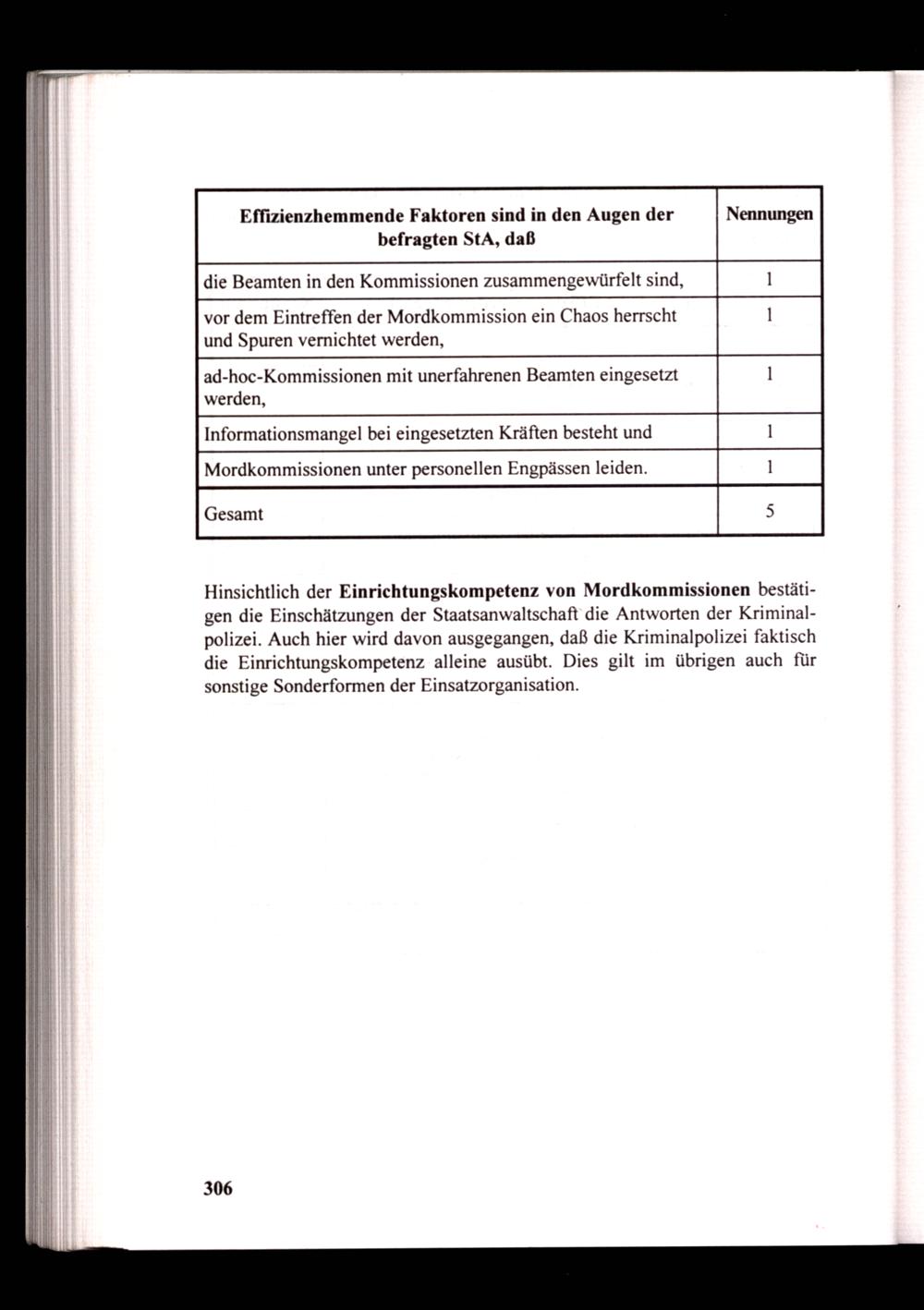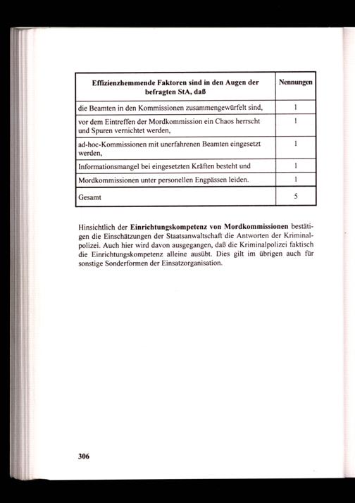 Hinsichtlich der Einrichtungskompetenz von Mordkommissionen bestätigen die Einschätzungen der Staatsanwaltschaft‘ die Antworten der Kriminalpolizei. Auch hier wird davon ausgegangen, daß die Kriminalpolizei faktisch die Einrichtungskompetenz alleine ausübt. Dies gilt im übrigen auch für sonstige Sonderformen der Einsatzorganisation.