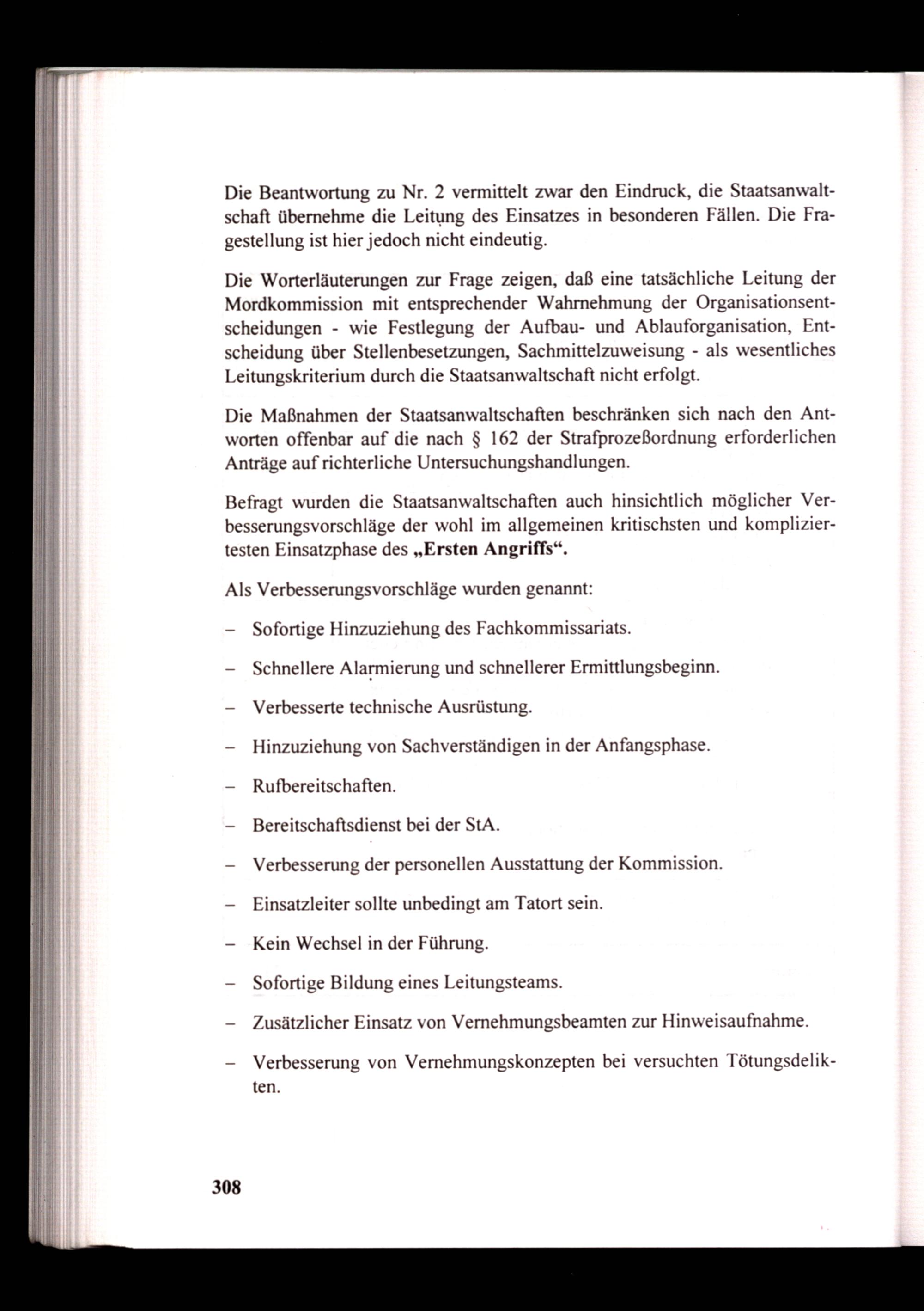 Befragt wurden die Staatsanwaltschaften auch hinsichtlich möglicher Verbesserungsvorschläge der wohl im allgemeinen kritischsten und kompliziertesten Einsatzphase des„Ersten Angriffs“.